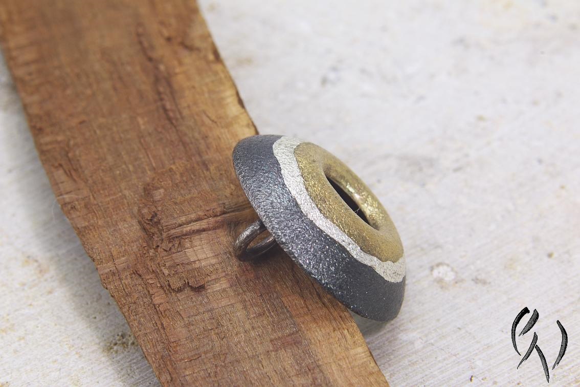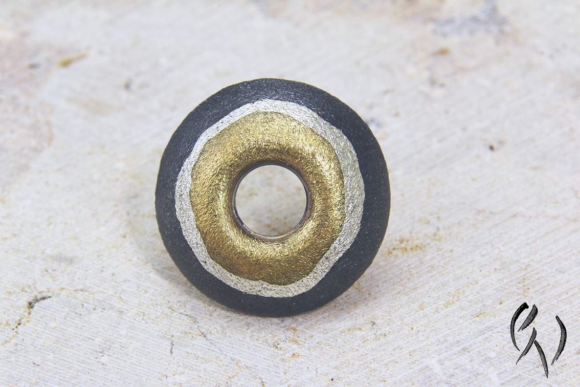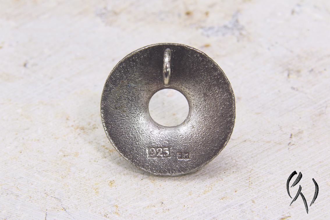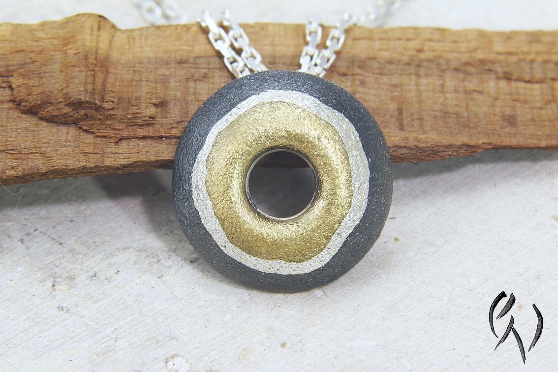 Der kleine Anhänger ist im Inneren der Scheibe vergoldet, der äußere Rand ist geschwärzt. Dazwischen ist ein schmaler, ungleichmäßiger silberfarbener Streifen.