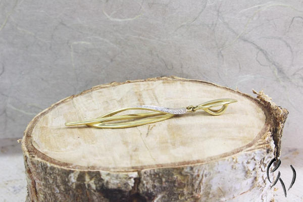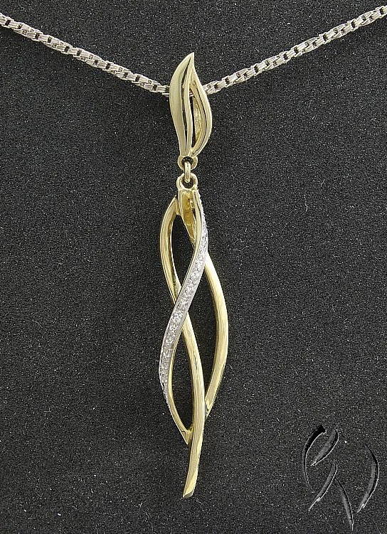 Hier habe ich einen wunderschönen, eleganten Anhänger aus Gold 585/-, Drei zarte Streifen liegen wie locker geflochten umeinander verschränkt. In dem oberen Streifen ist ein winziger Diamanten eingefasst. Da aber der ganze Streifen rhodiniert ist (mit Rhodium beschichtet), wirkt es so, als ob mehrere winzige Diamanten eingefasst wären.