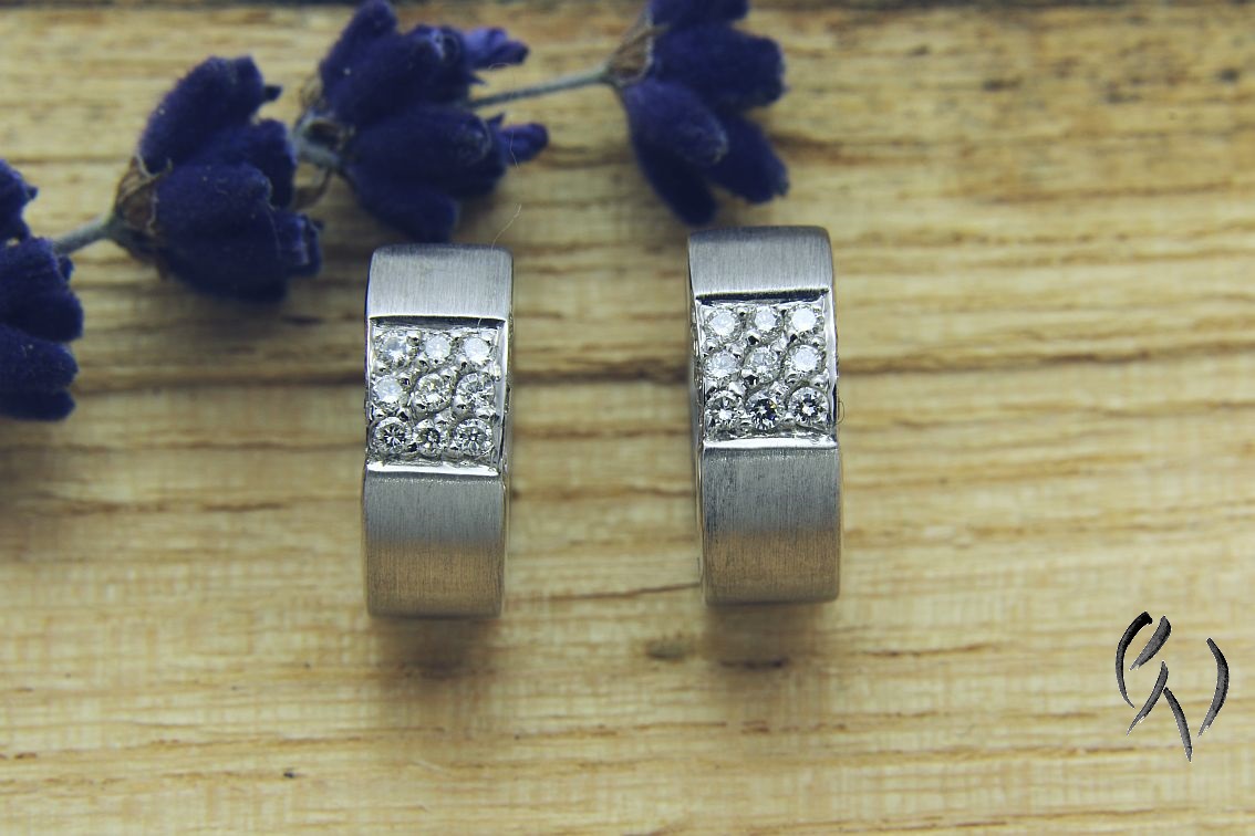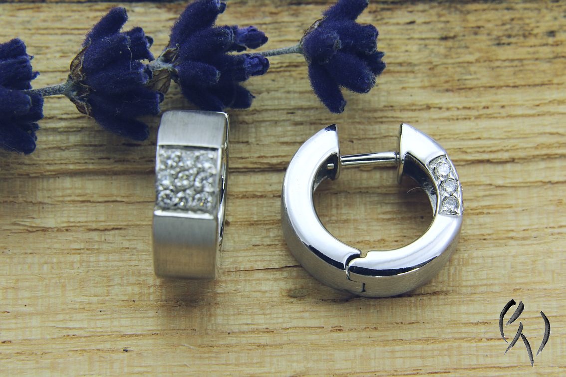 Die schlichten Creolen sind auf der Vorderseite mattiert und seitlich poliert. In der Mitte sind 3 Reihen mit je drei kleinen Brillanten eingefasst, und auf jeder Seite außen nochmal drei. Zusammen haben die Brillanten pro Creole ca 0,11ct.