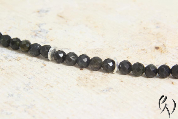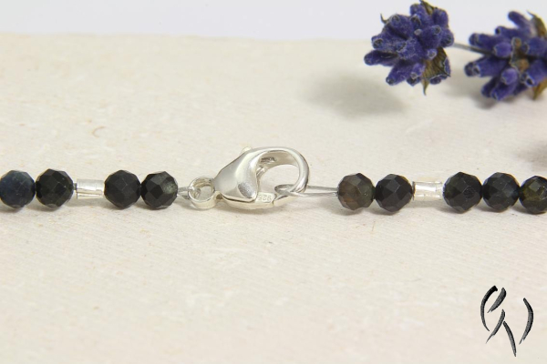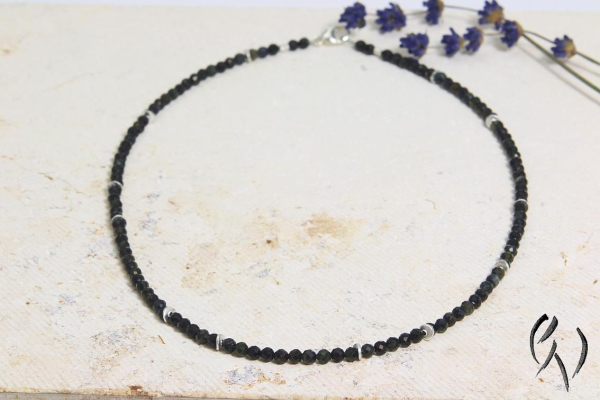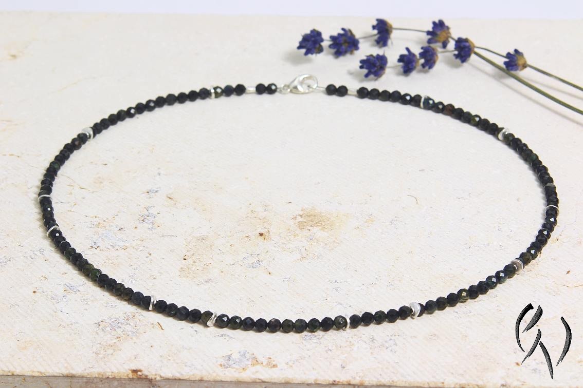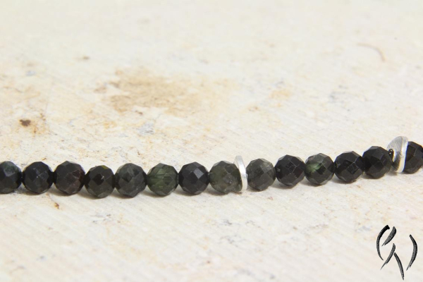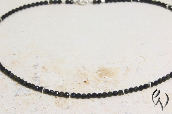 Diese zarten Kette besteht aus schwarz-grünen Turmalinperlchen, die ich mict kleinen silbernen Scheiben kombiniert habe. Die Anordnung der Zwischenteile ist zufällig.