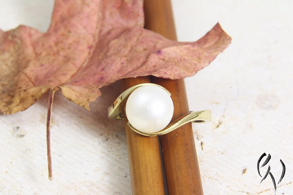 Die feine Ringschiene legt sich zart um die Perle und scheint sie damit zu schützen und zu halten. Die große Perle erdrückt die zarten Linien dank ihrer Schlichtheit nicht, sondern fügt sich harmonisch darin ein.