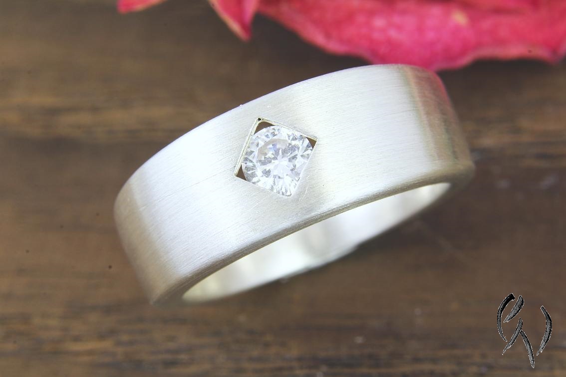 DIe Oberfläche des Rings ist strichmatt.Die Ringschiene ist zwischen 7,4 und 4 mm breit, der Zirkonia hat einen Durchmesser von 4 mm.