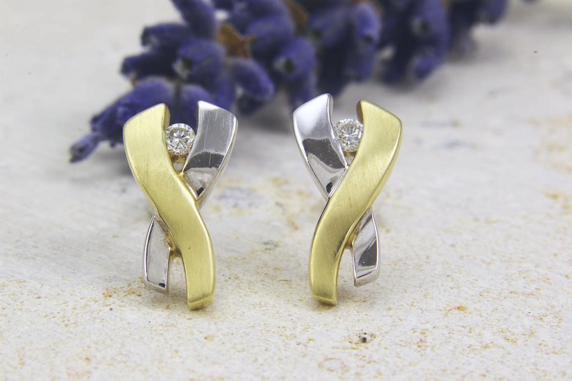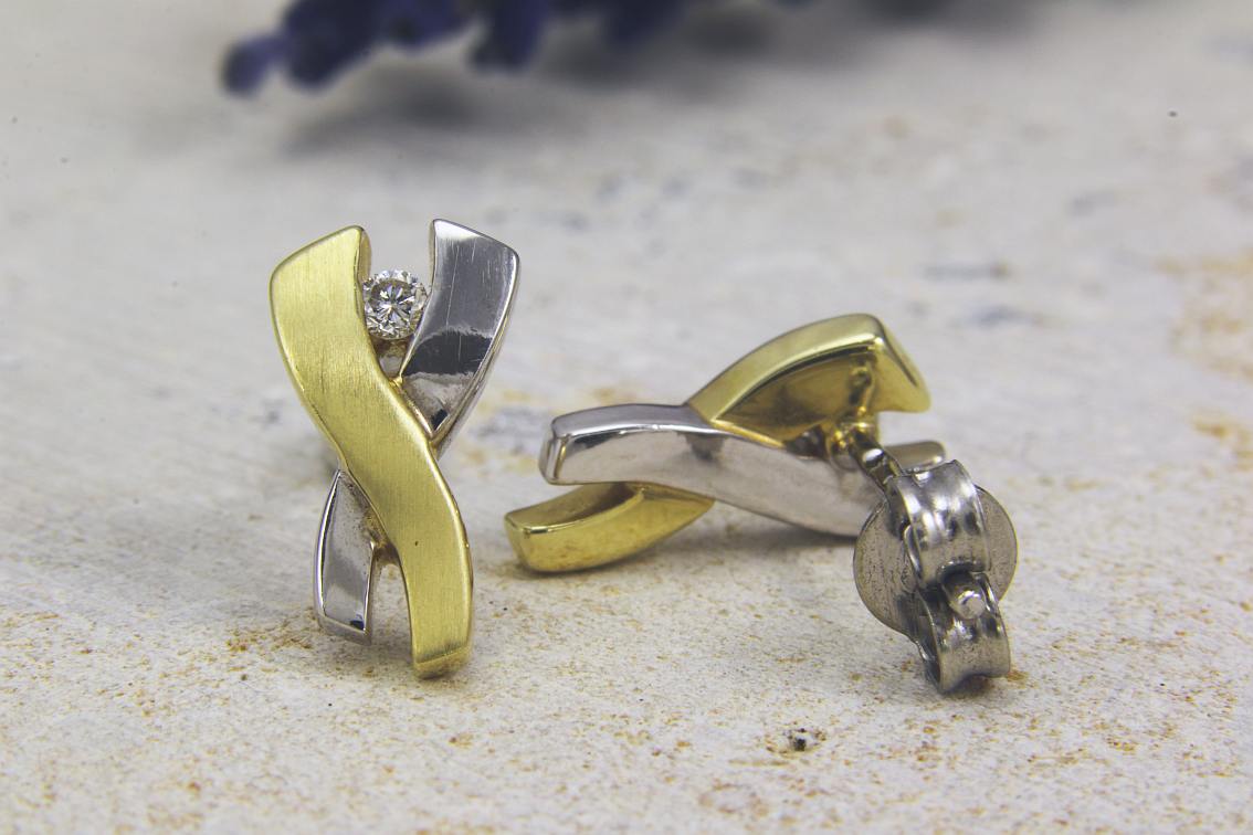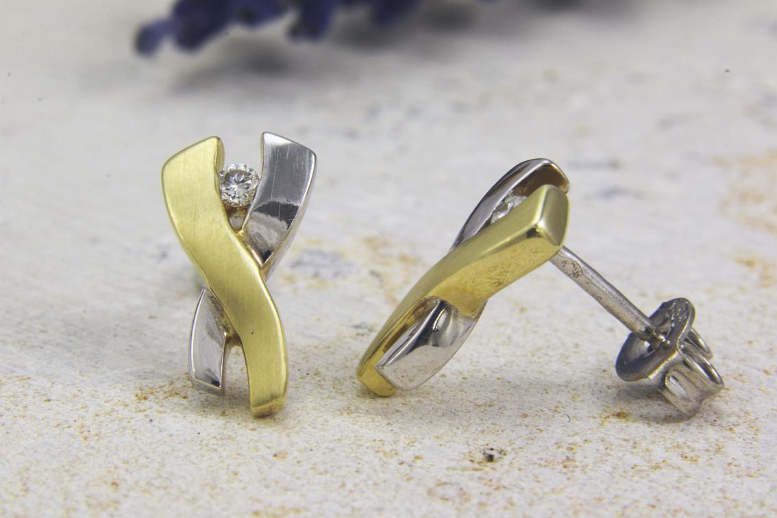 Je ein weißgoldener und gelbgoldener Streifen überkreuzen einander mit einem sanften Schwung. In dem oberen Teil halten sie einen Brillanten von 0,02 ct der Qualität w/si.