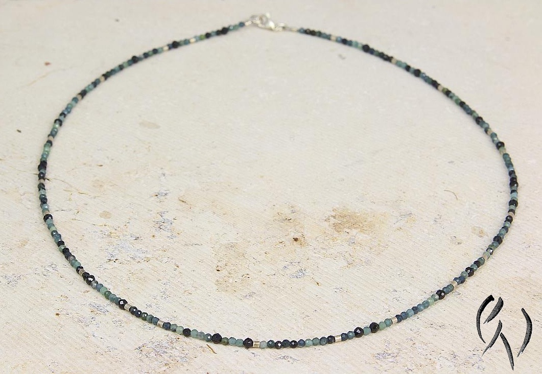 Bei dieser zarten Kette habe ich feine hellblaugrüne bis dunkelgrüne Turmalinperlchen mit etwas größeren Perlen aus schwarzem Spinell kombiniert. Dazwischen finden sich auch kleine silberne Zwischenteilchen, die noch einen anderen Glanz in die Kette bringen. Die Steinperlen sind facettiert, dadurch glitzern sie schön am Hals.