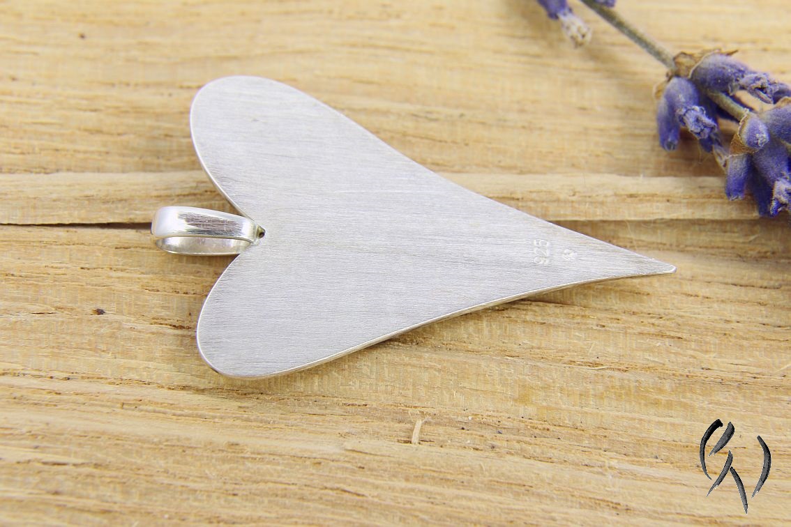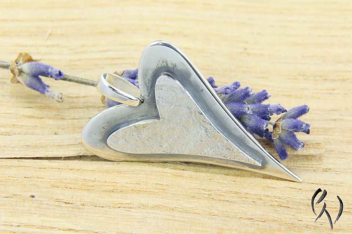 Das untere, größere Herz ist poliert und anschließend leicht geschwärzt. Das kleinere, aufgesetzte Herz hat eine papierstrukturierte Oberfläche. Die Außenkante sind poliert.