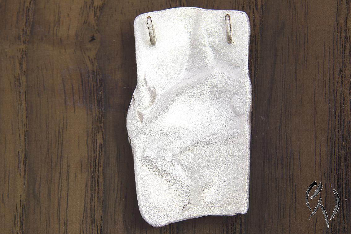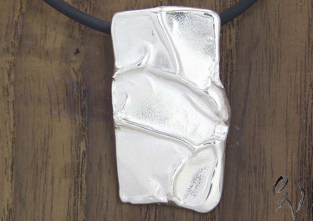Dieser auffällige Anhänger aus Silber wirkt allein durch seine Struktur und die verschiedenen Oberflächen.Die flacheren, vertieften Flächen sind mattiert, während die erhabenen Flächen poliert sind. Die unregelmäßige Oberfläche findet sich auch in den Außenlinien wieder, das Rechteck wird durch die Struktur aufgelockert und die Strenge der Form dadurch abgemildert.