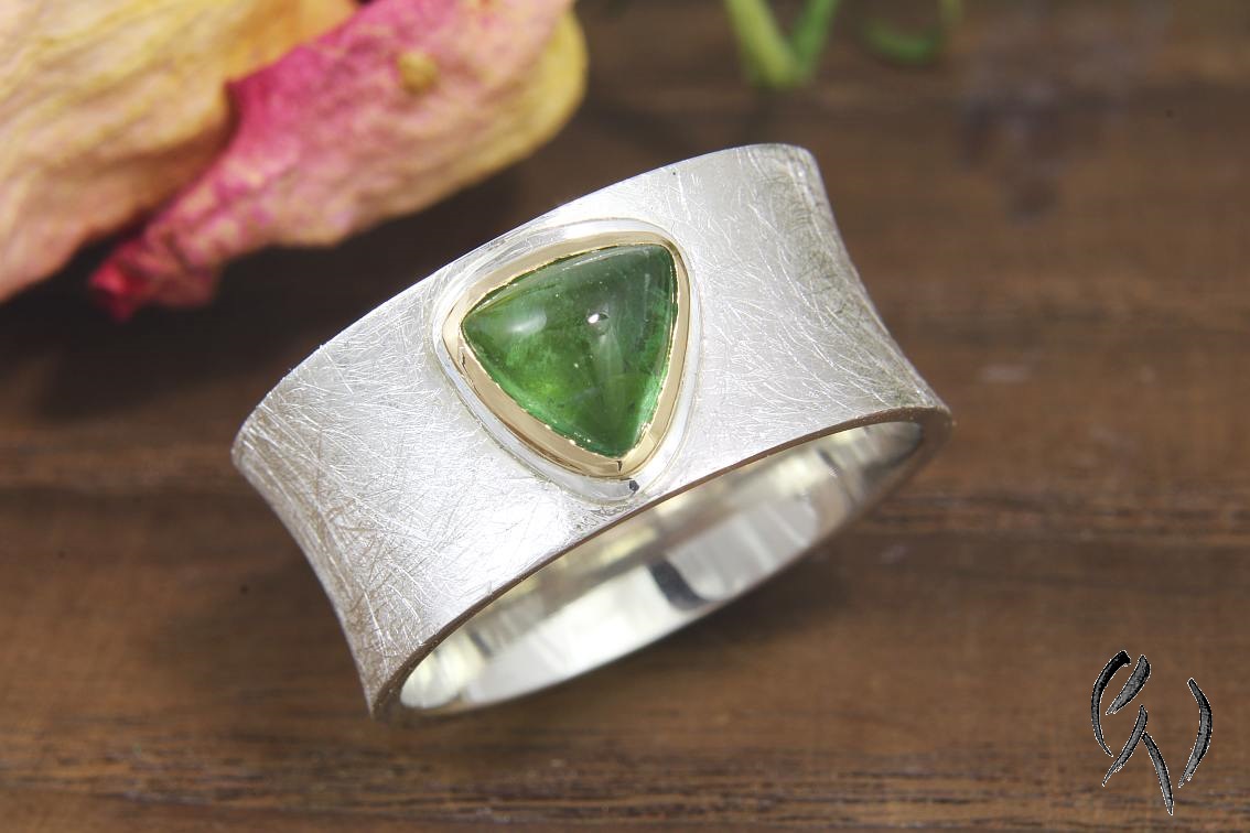 Auf den breiten Ring habe ich einen dreieckigen Turmalin im Cabochonschliff aufgesetzt. Der grüne Stein ist in einer Fassung aus Gold eingefasst. Die Ringschiene ist mattgekratzt mit polierten Außenseiten, die goldene Fassung ist ebenfalls poliert.