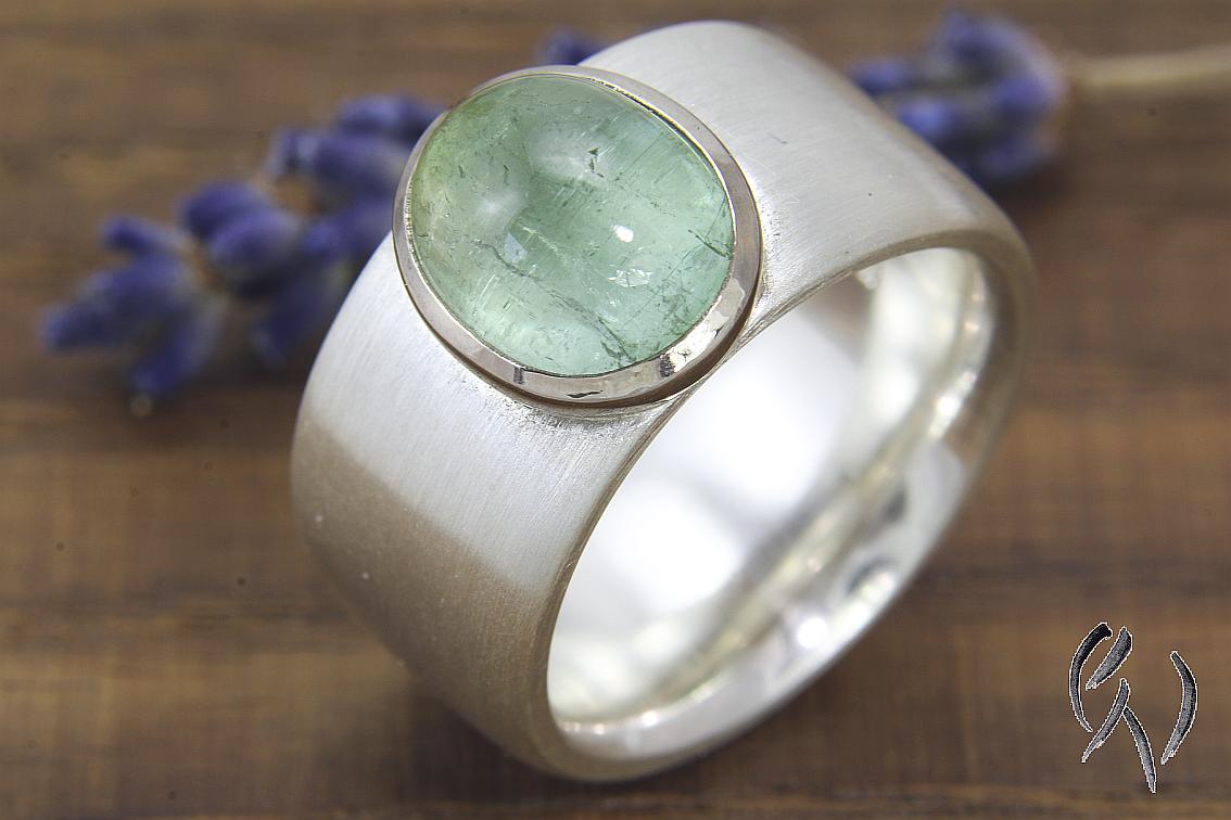Auf dem breiten Ring aus Silber habe ich eine dicke Weißgoldfassung aufgesetzt. Darin ist ein hellblauer Turmalin im Cabouchonschliff eingefasst.