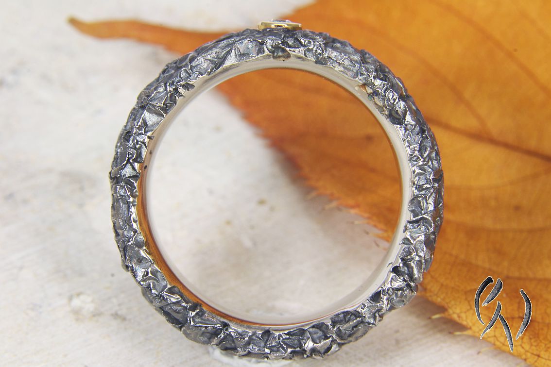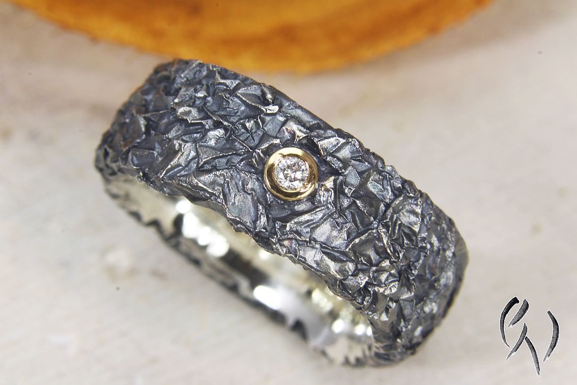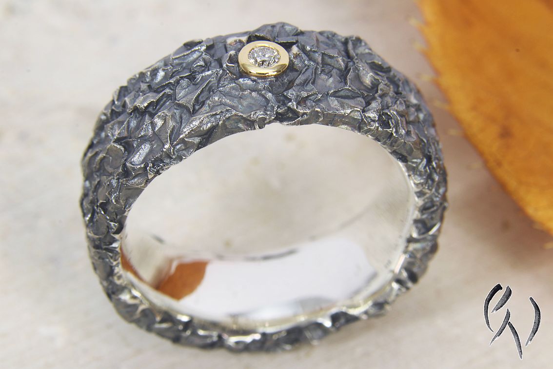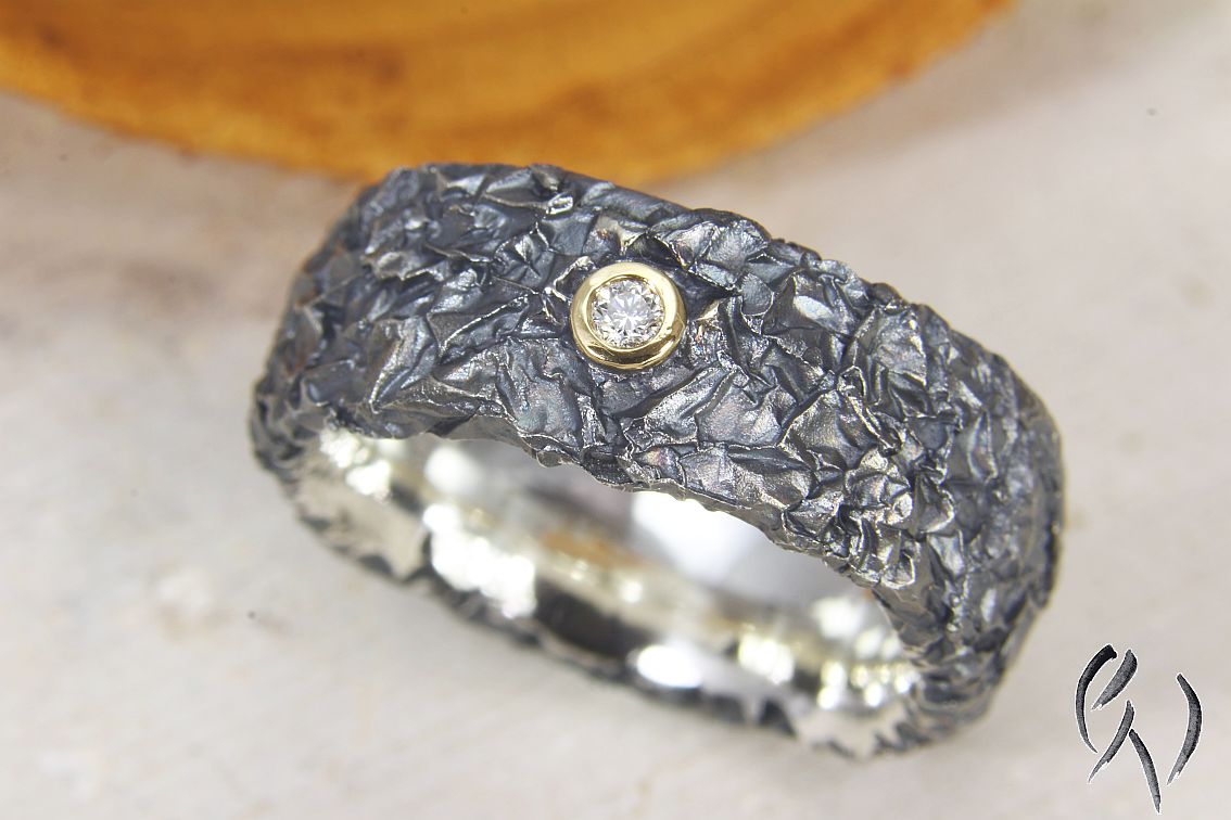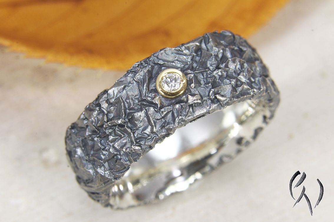 Der Ring hat die typische zerknitterte Oberfläche, die Fassung ist poliert.