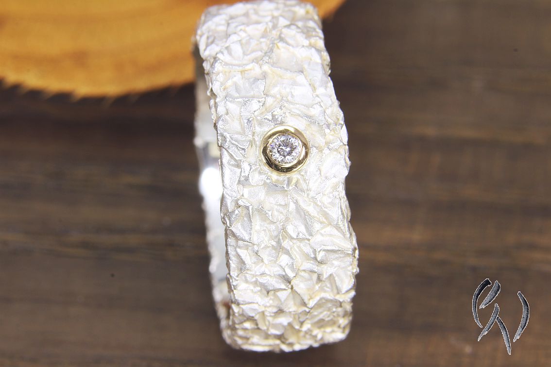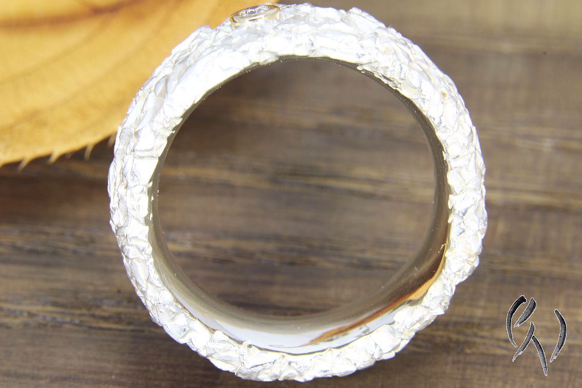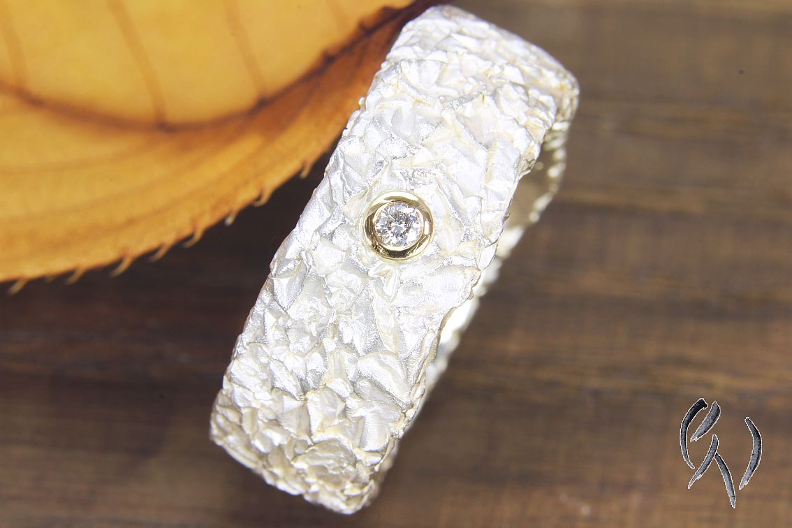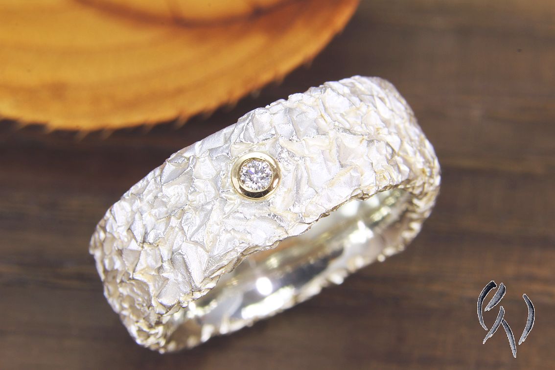 Der Ring hat die typische zerknitterte Oberfläche, die Fassung ist poliert.