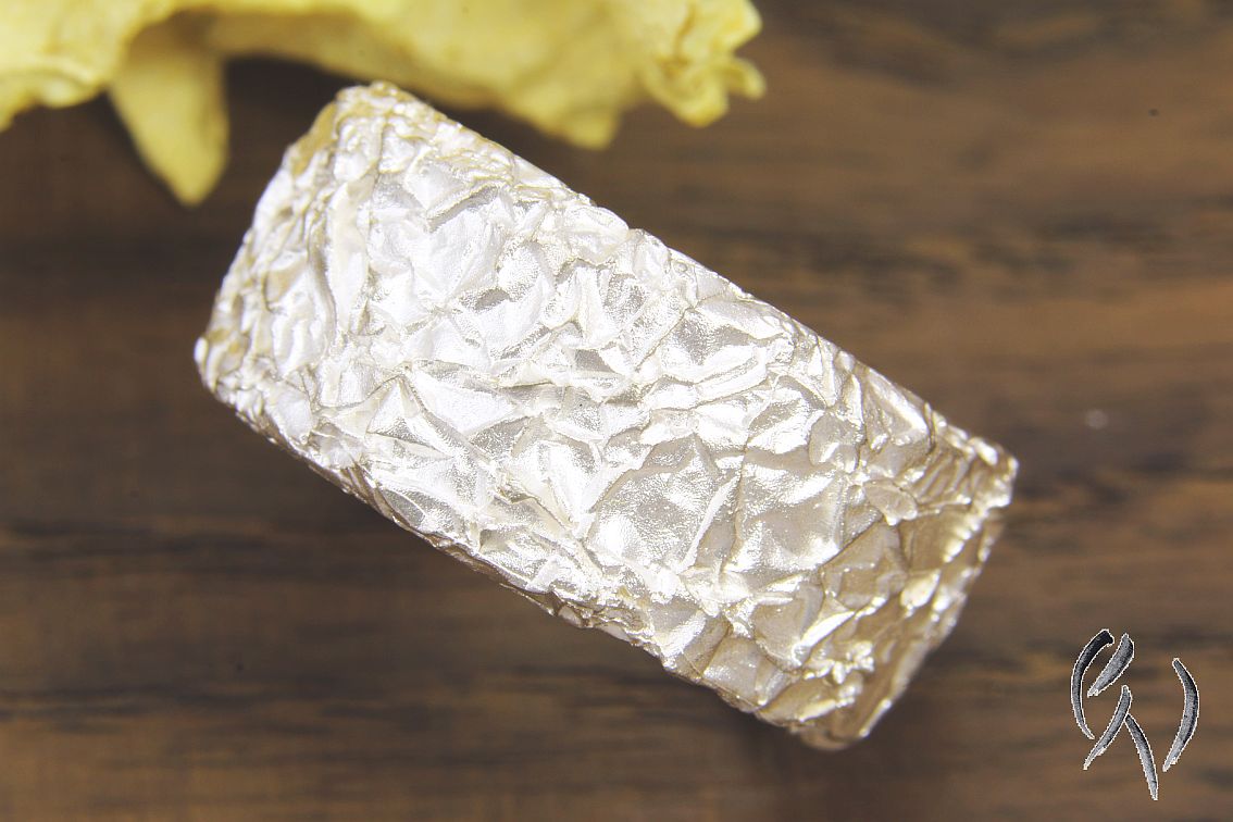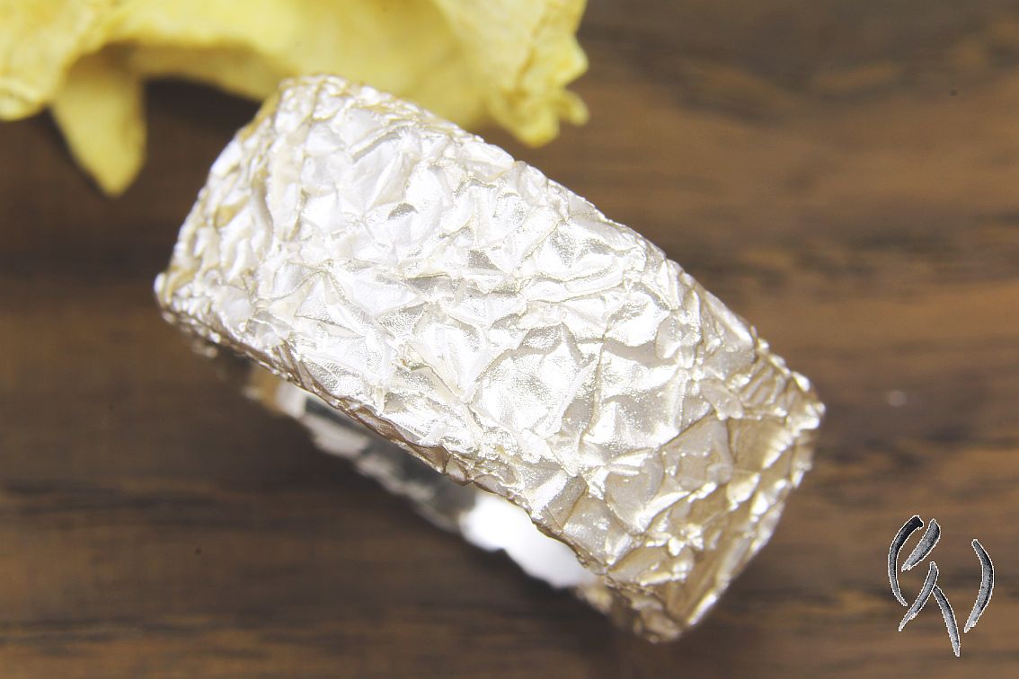 Wie bei allen Ringen dieser Serie hat auch dieser eine Oberfläche, die wie zerknitterte Folie aussieht. Der Ring hat einen flachen, eckigen Querschnitt..