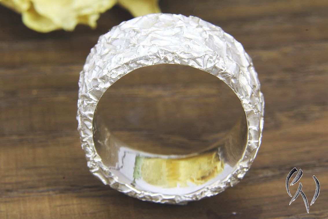 Innen ist der Ring weich abgerundet, dadurch ist er trotz der Knitterstruktur gut zu tragen.