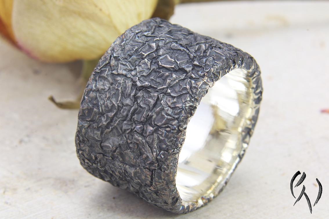 Innen ist der Ring leicht abgerundet, dadurch ist er trotz der Knitterstruktur gut zu tragen.Bei dieser Ausführung habe ich die Oberfläche geschwärzt, was dem Ring eine völlig andere, aber genauso schöne Wirkung gibt.