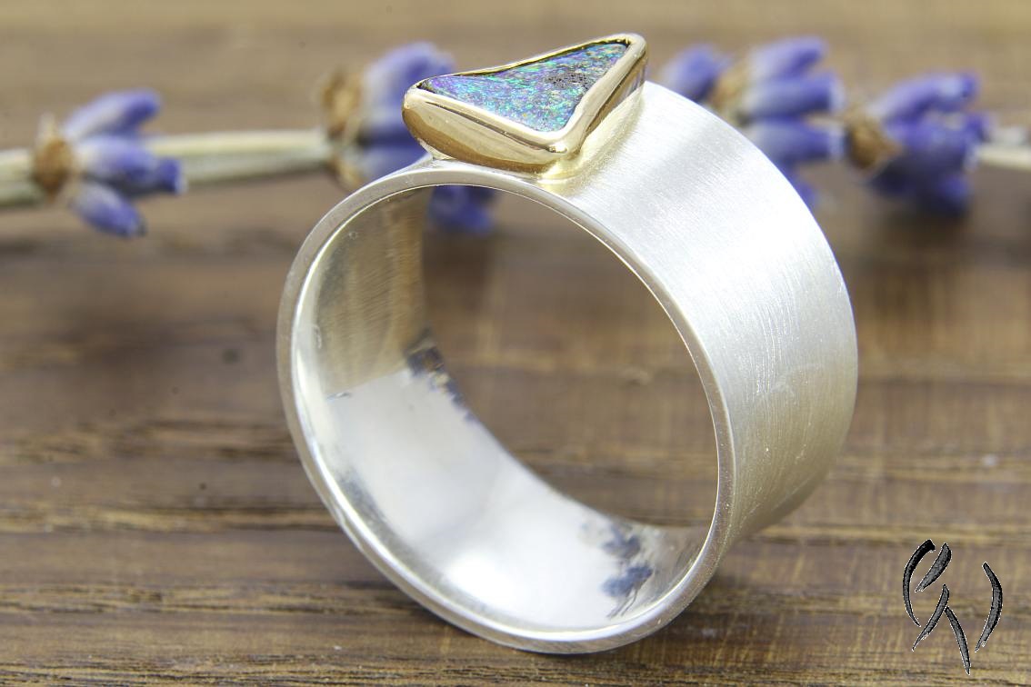 Auf diesen breiten, konkav gewölbten Ring habe ich einen dreieckigen Boulderopal aufgesetzt. Eingefasst ist der Opal in einer feinen Fassung aus Gold 750/-. Dadurch leuchten die Blau- und Grüntöne des Opals wunderschön.