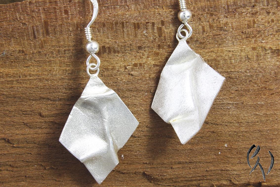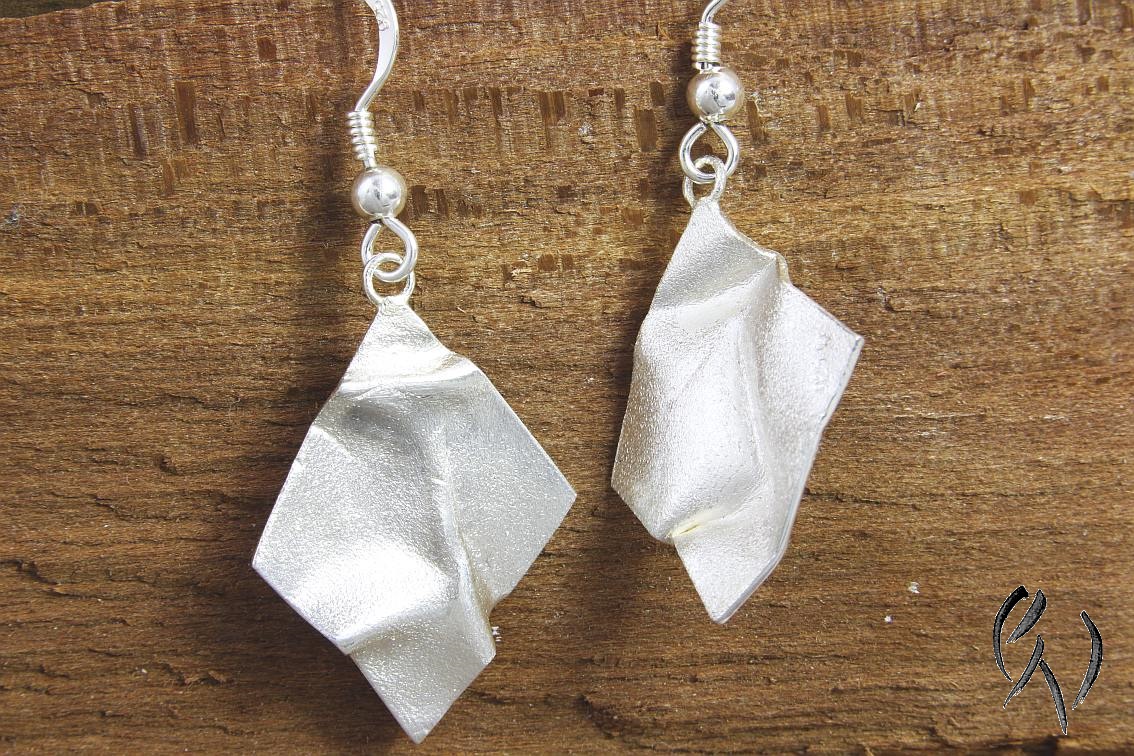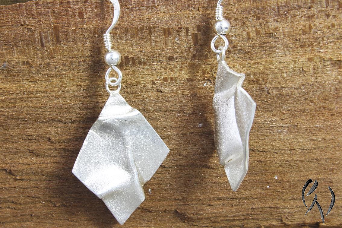 Bei diesen Ohrhängern mit einer wie zerknautscht wirkenden Oberfläche wechseln sich erhöhte, glänzend polierte Stellen mit seidenmatten, vertieften Flächen ab.