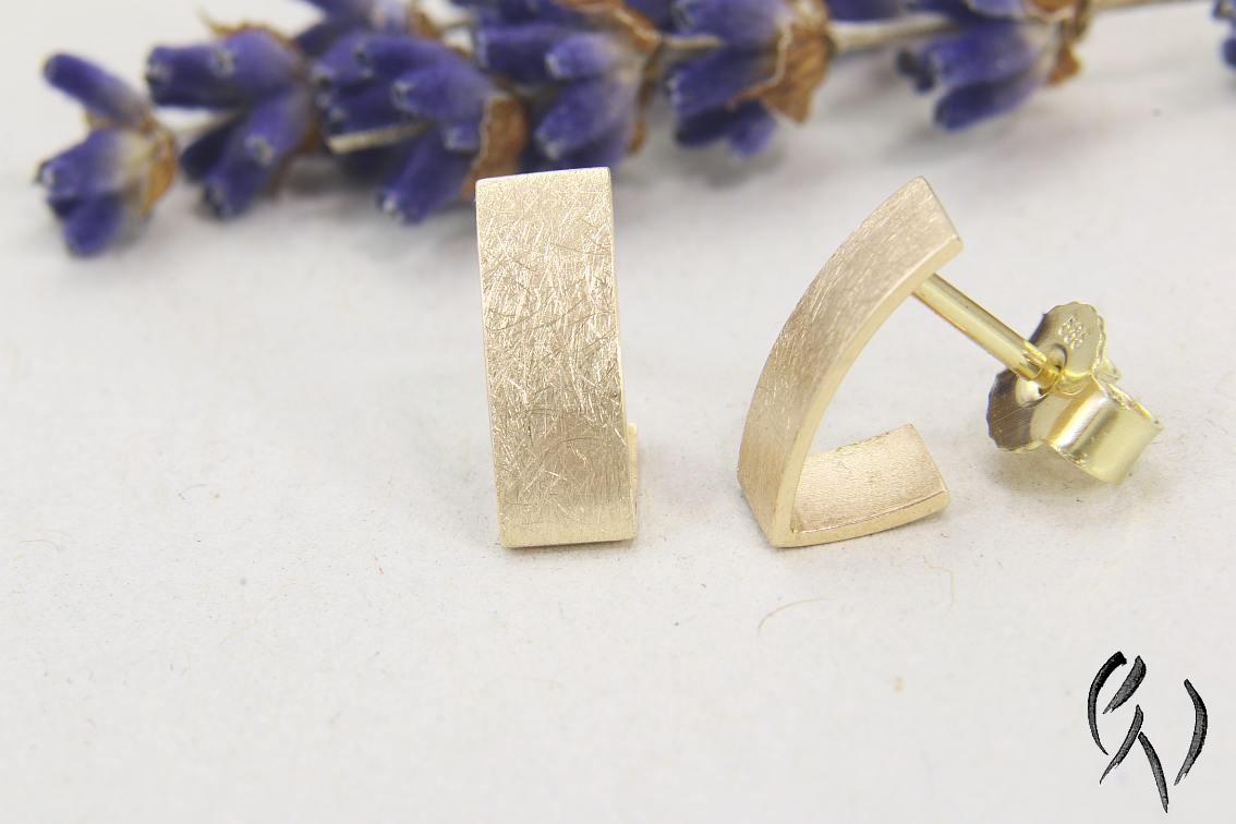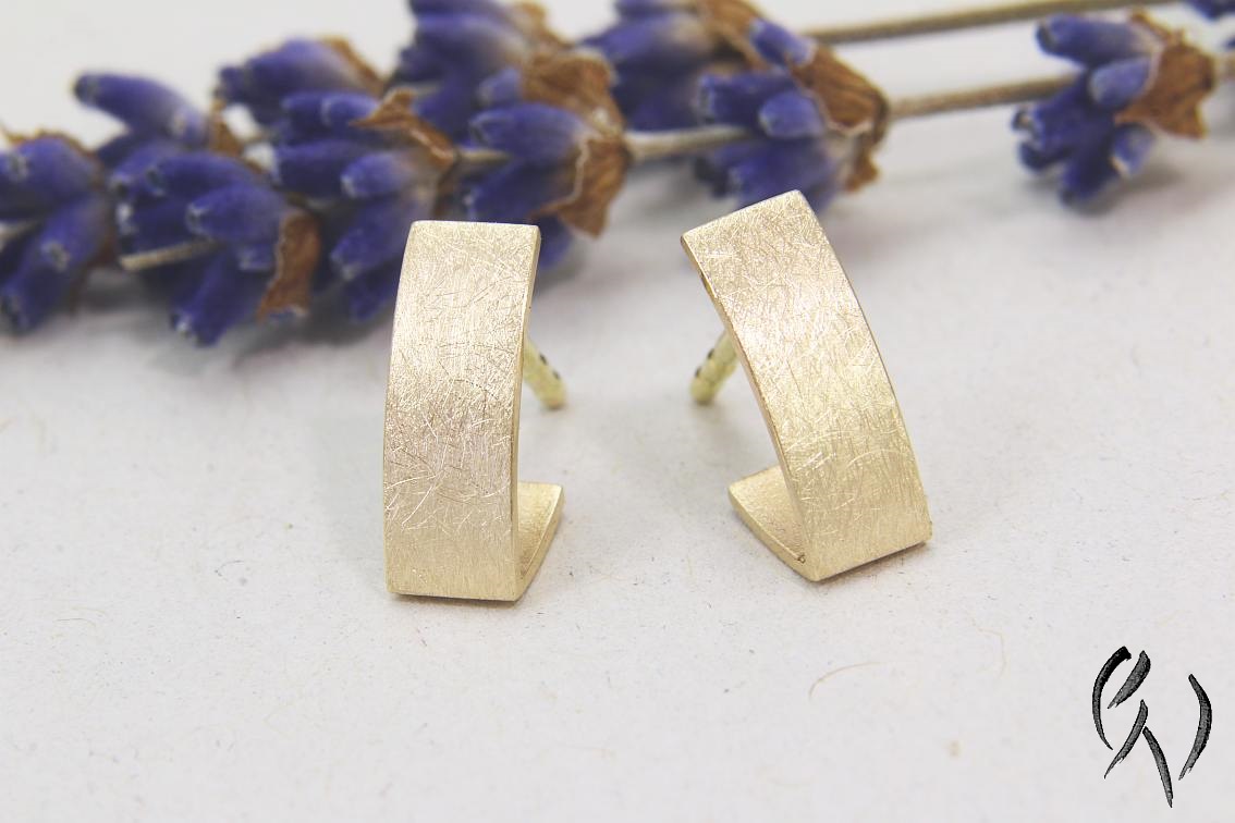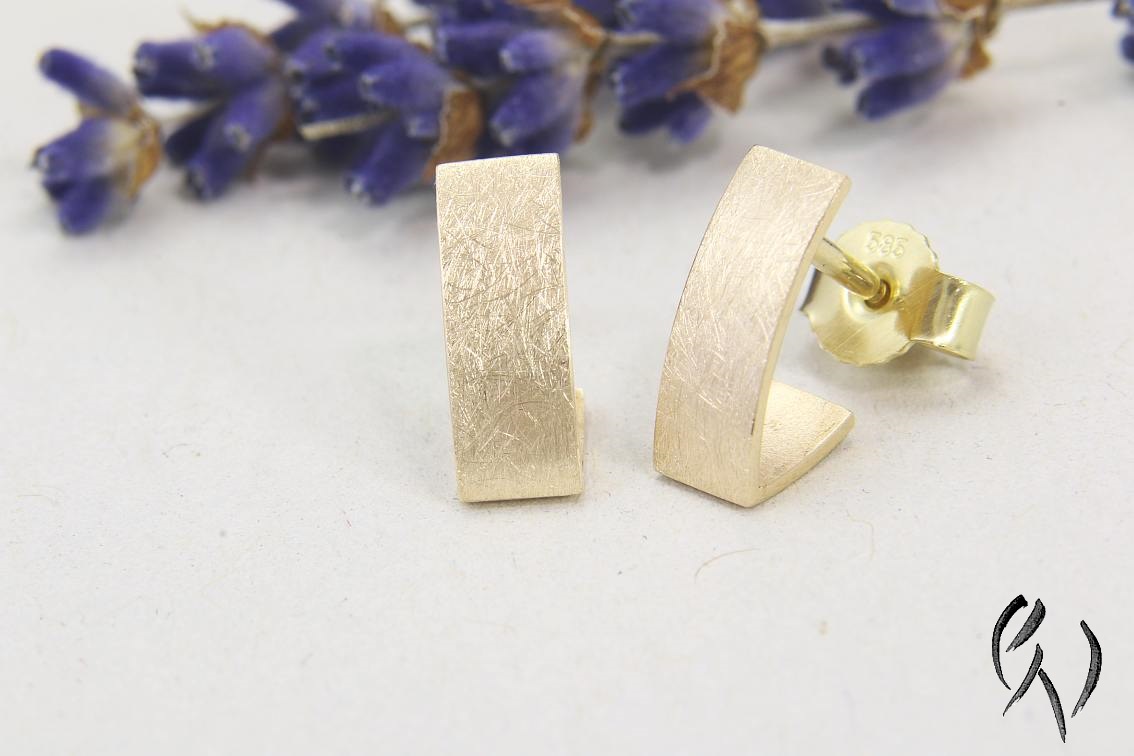 Ein schmaler Streifen aus mattgekratztem Roségold 585/- legt sich in einem sanften Bogen um das Ohrläppchen und knickt am unteren Ende nach hinten ab. Dadurch ergibt sich die Optik einer kleinen Creole.