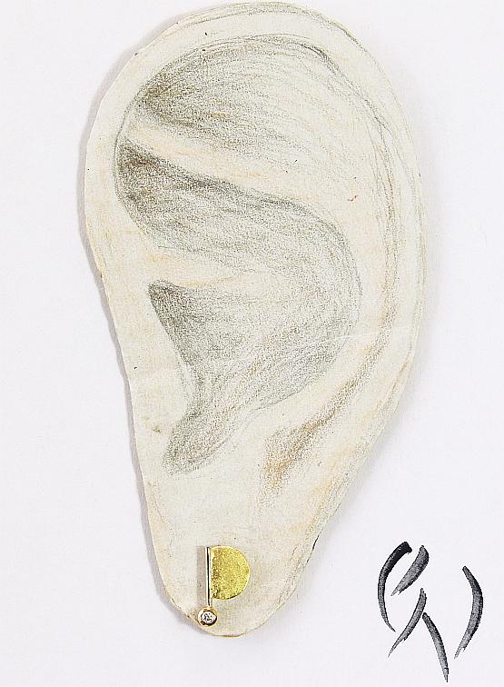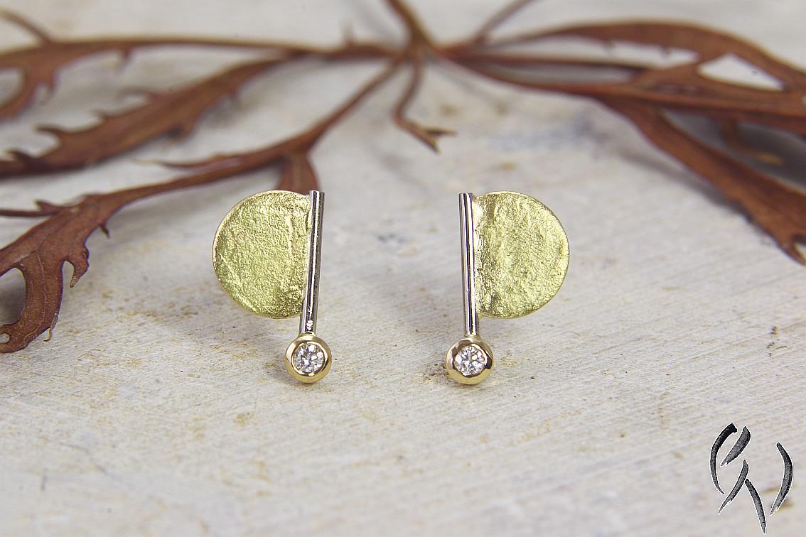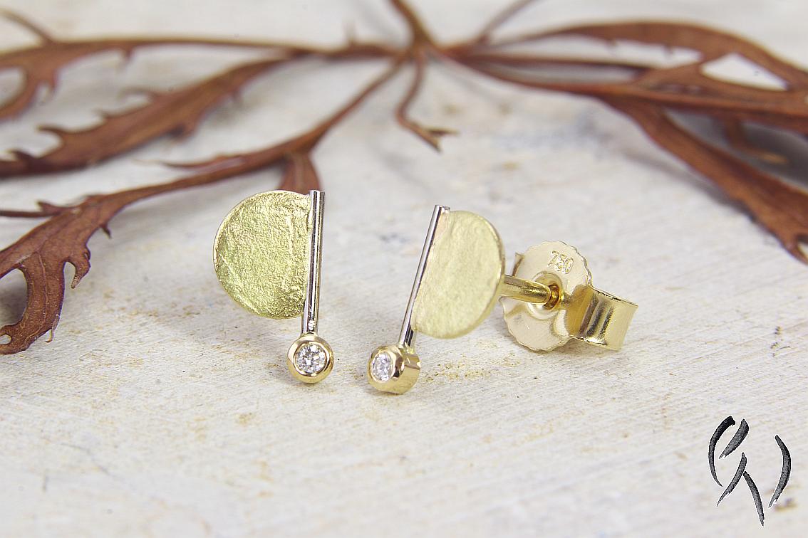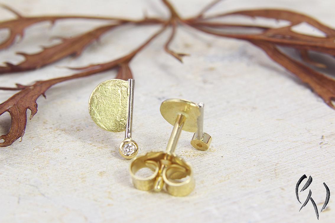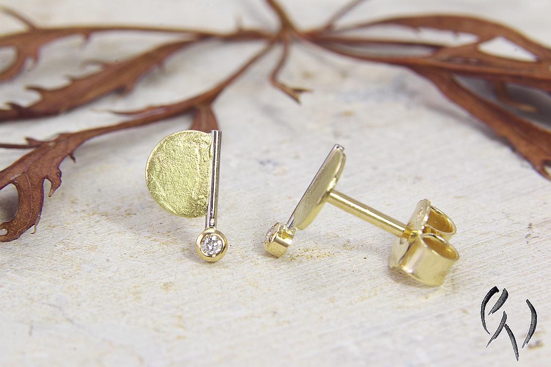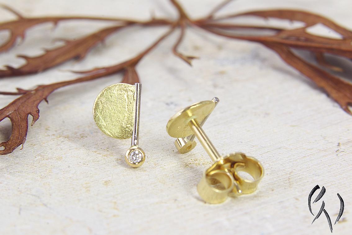 An einem feinen Weißgolddraht ist seitlich eine gelbgoldene, papierstrukturierte Halbscheibe angesetzt. Unten an dem Draht ist eine Fassung aus Gelbgold, in der ein kleiner Brillant eingefasst ist.