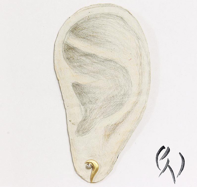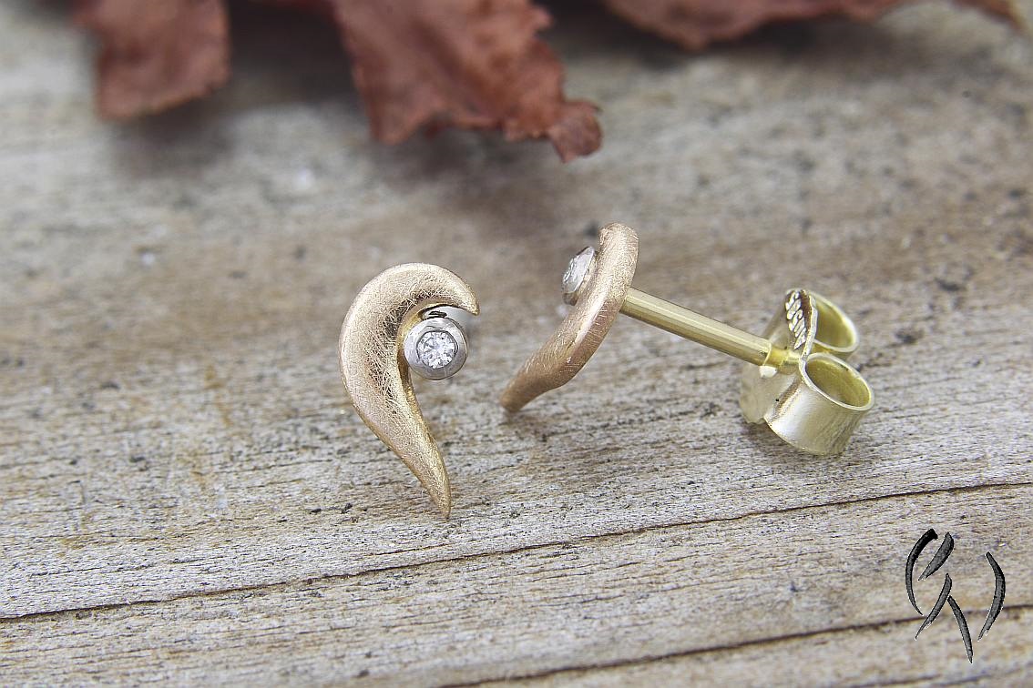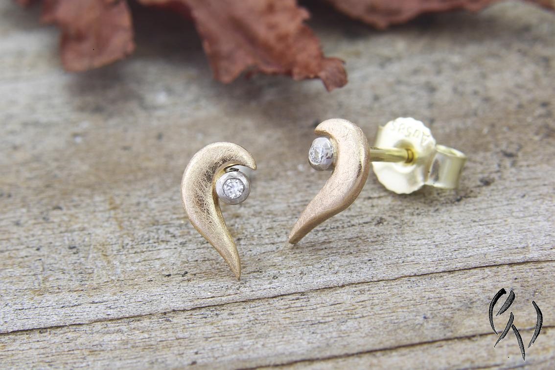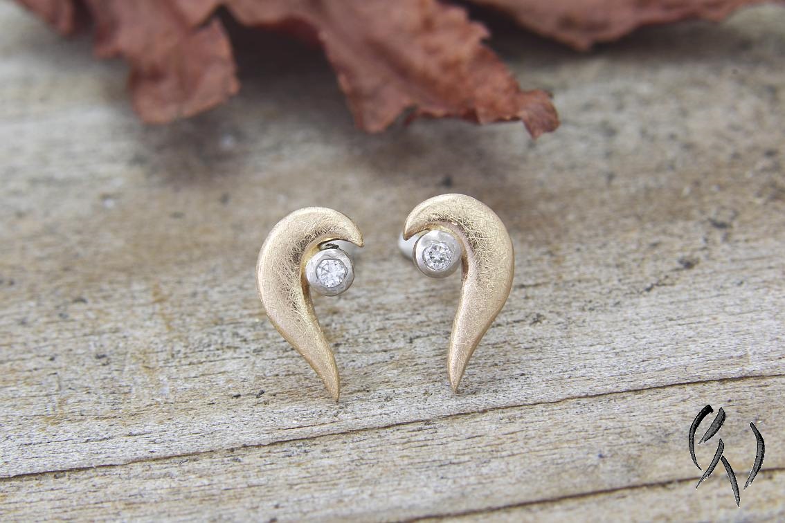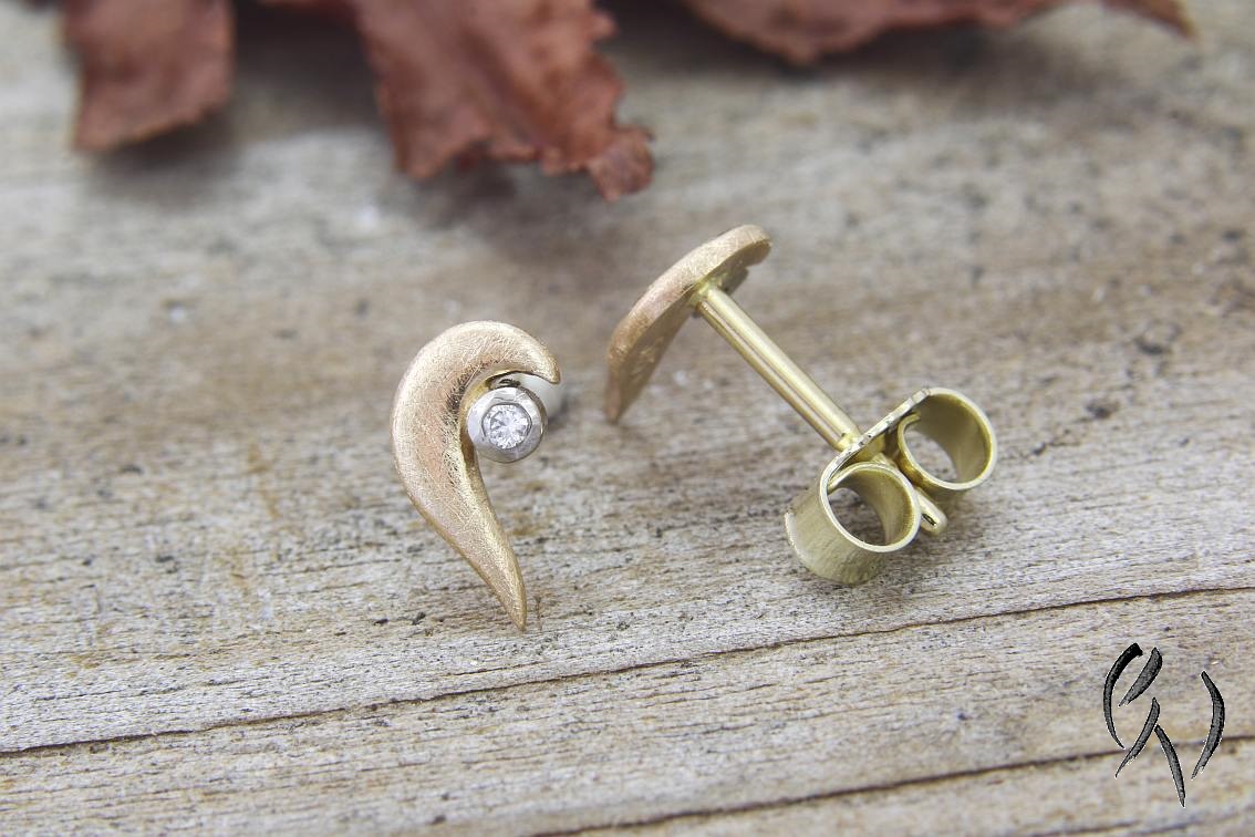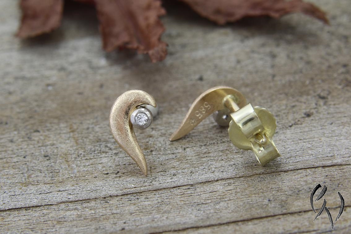 Hier habe ich ein Paar kleine Ohrstecker aus Roségold 585/-. An das roségoldene, geschwungene Teil ist eine weißgoldene Fassung mit einem kleinen Brillanten angesetzt.