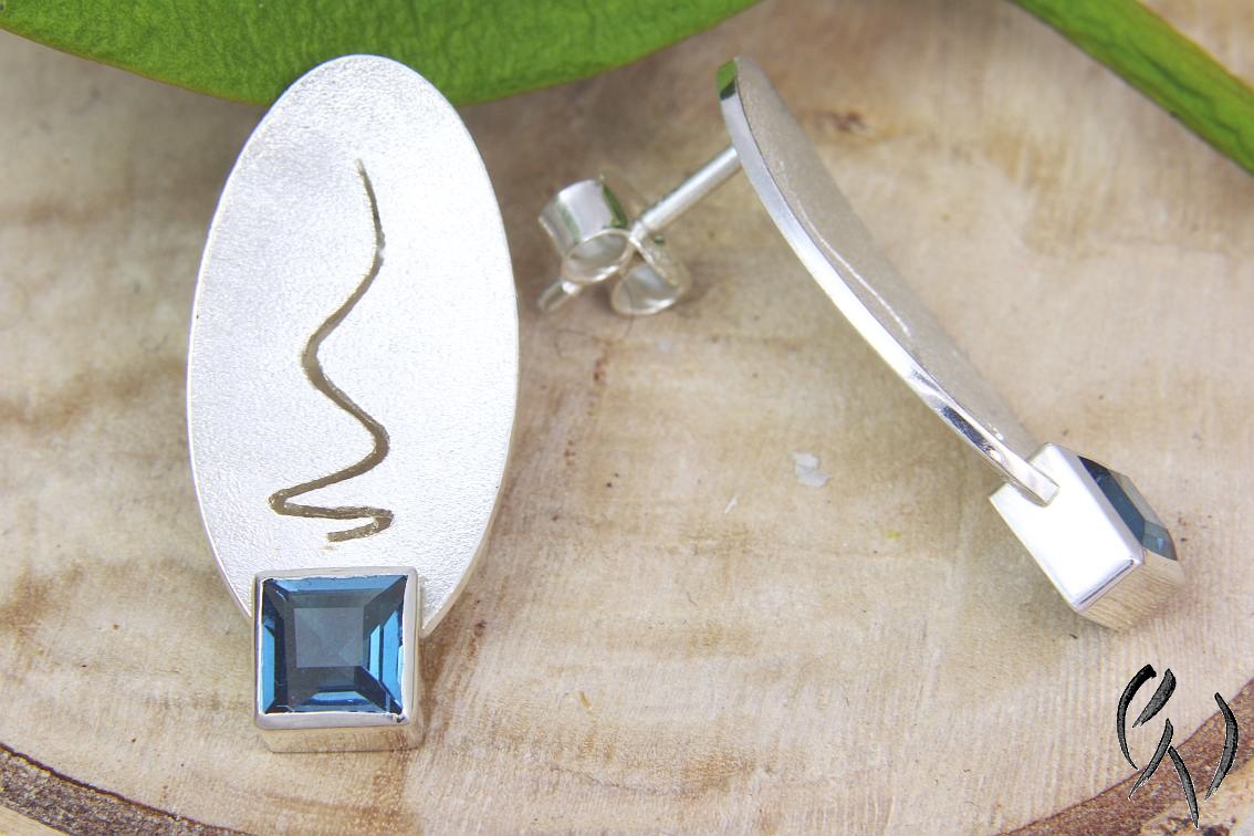 Die Oberfläche des Steckers ist mattgeschlagen, die leicht sichtbaren Außenseiten und die Fassungen sind poliert. Das weiße Silber bringt das tiefe Blau der Topase schön zum Leuchten.