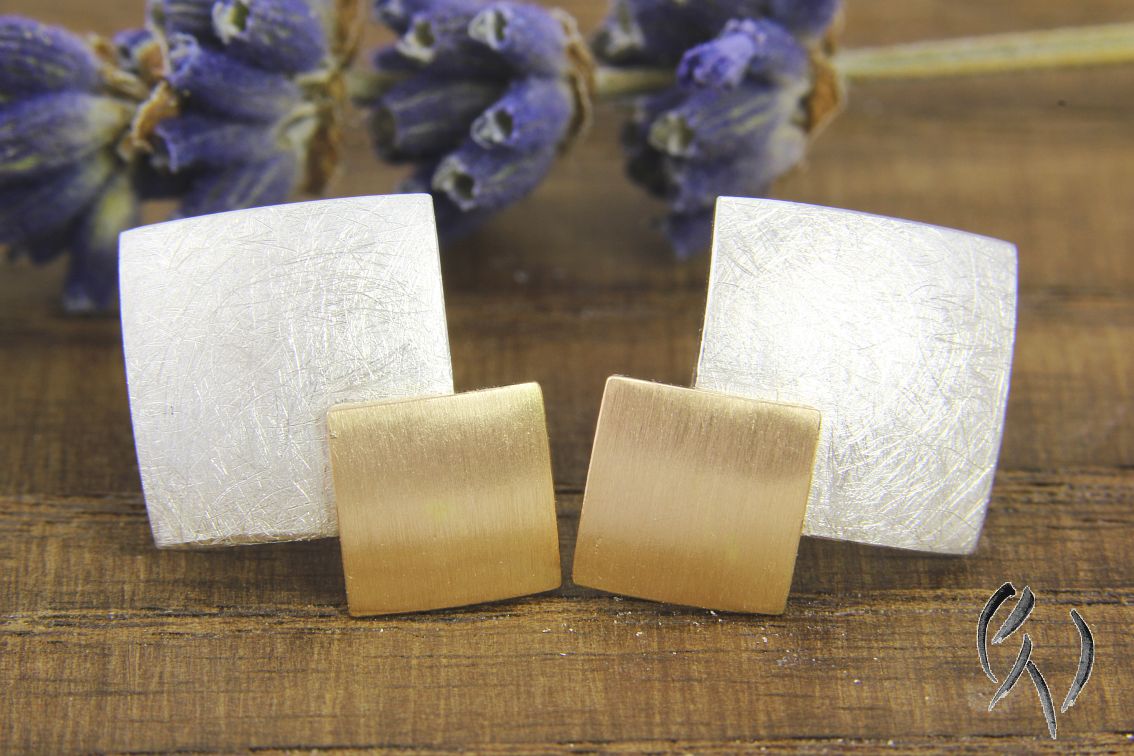 Bei diesen Ohrsteckern aus Silber ergänzen sich ein großes und ein kleineres Quadrat zu einer Einheit. Die verschiedenen Größen werden auch noch durch unterschiedlichen Materialien betont.