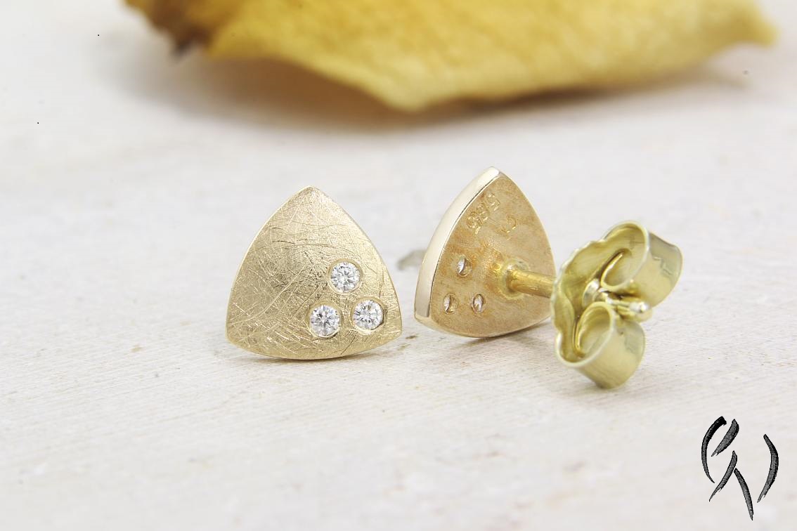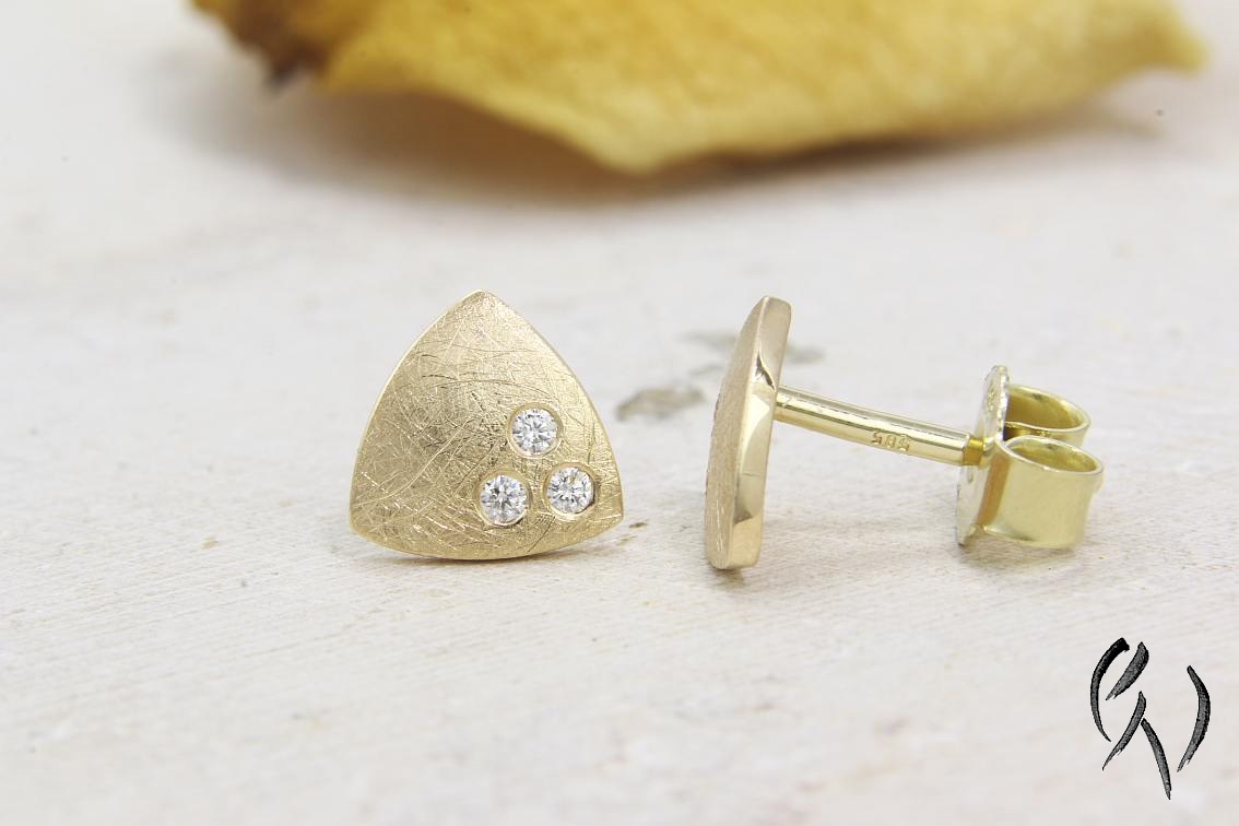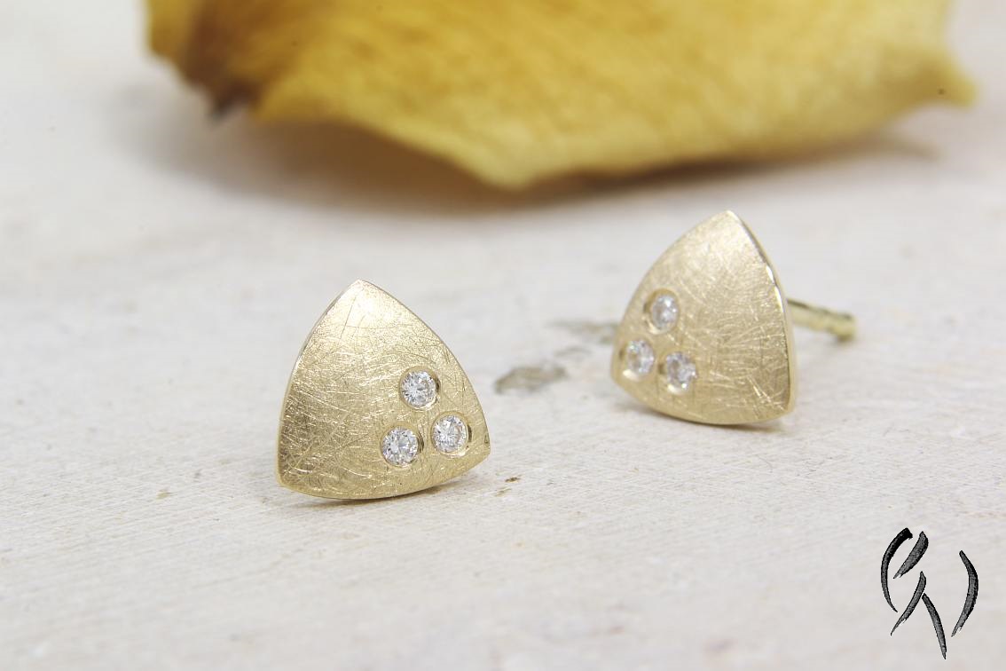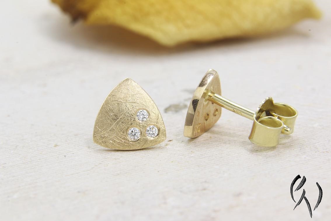 Sie sind wunderschöne Begleiter für jeden Tag. Mit ihrer leicht gewölbten, matten Oberfläche haben sie eine tolle Wirkung am Ohr. Als kleinen Blickfang habe ich in einer Ecke drei kleine Brillanten eingefasst.