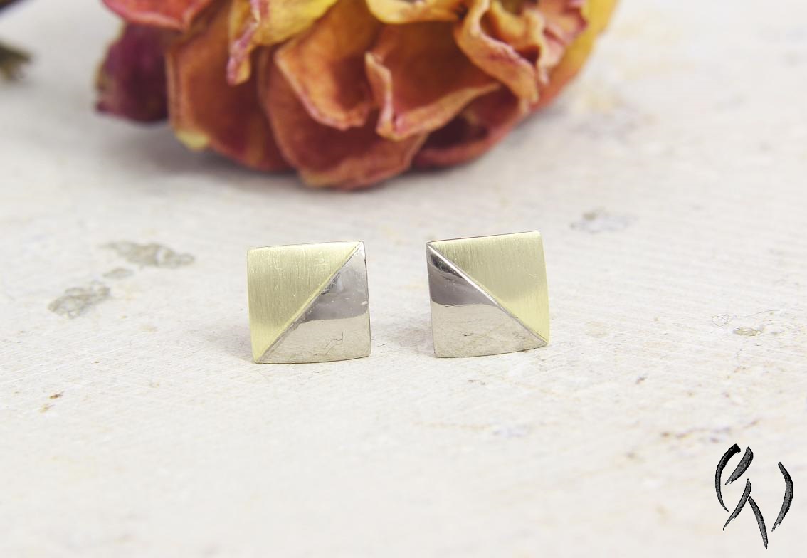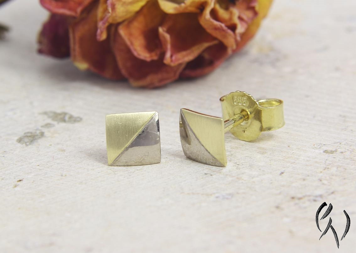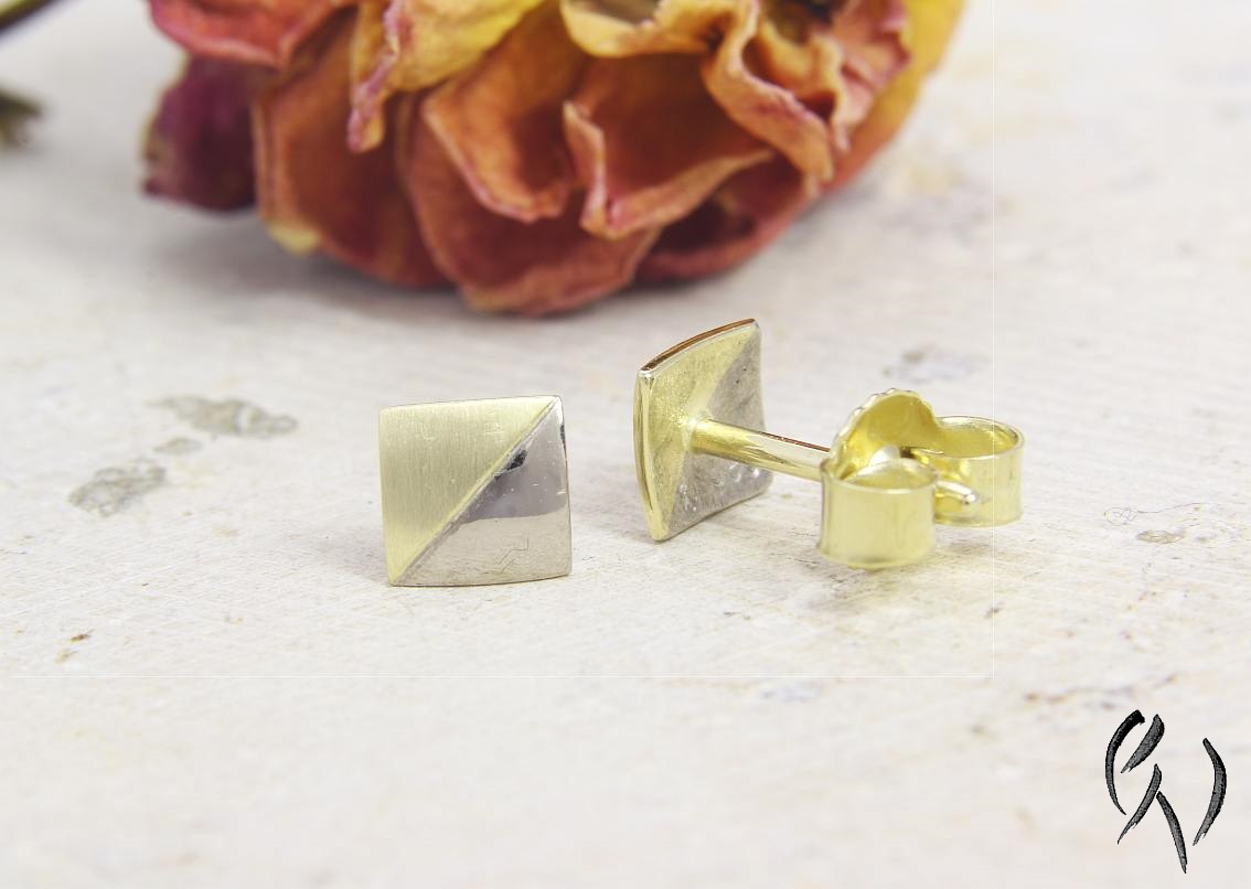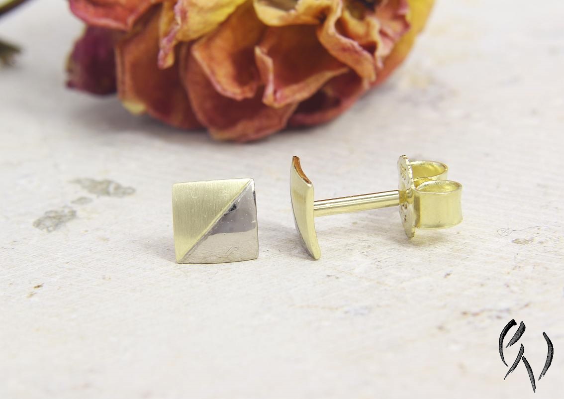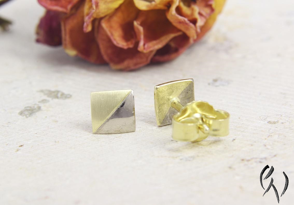 Das Quadrat ist aus zwei Dreiecken zusammengesetzt: einem polierten Weißgolddreieck und einem strichmatten Gelbgolddreieck. Durch die unterschiedlichen Oberflächenstrukturen kommen die zwei Farben der Ohrstecker noch schöner zum Vorschein.