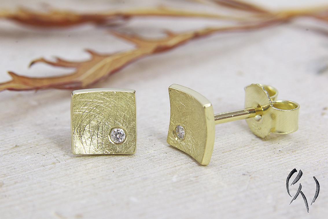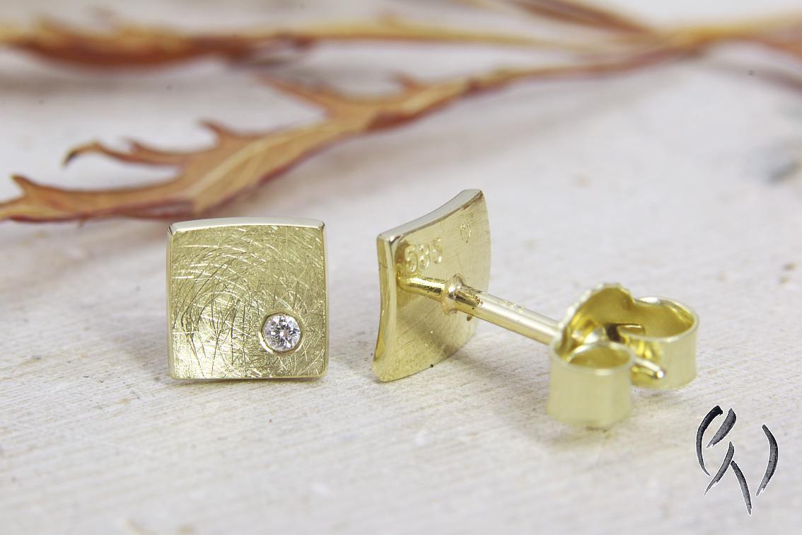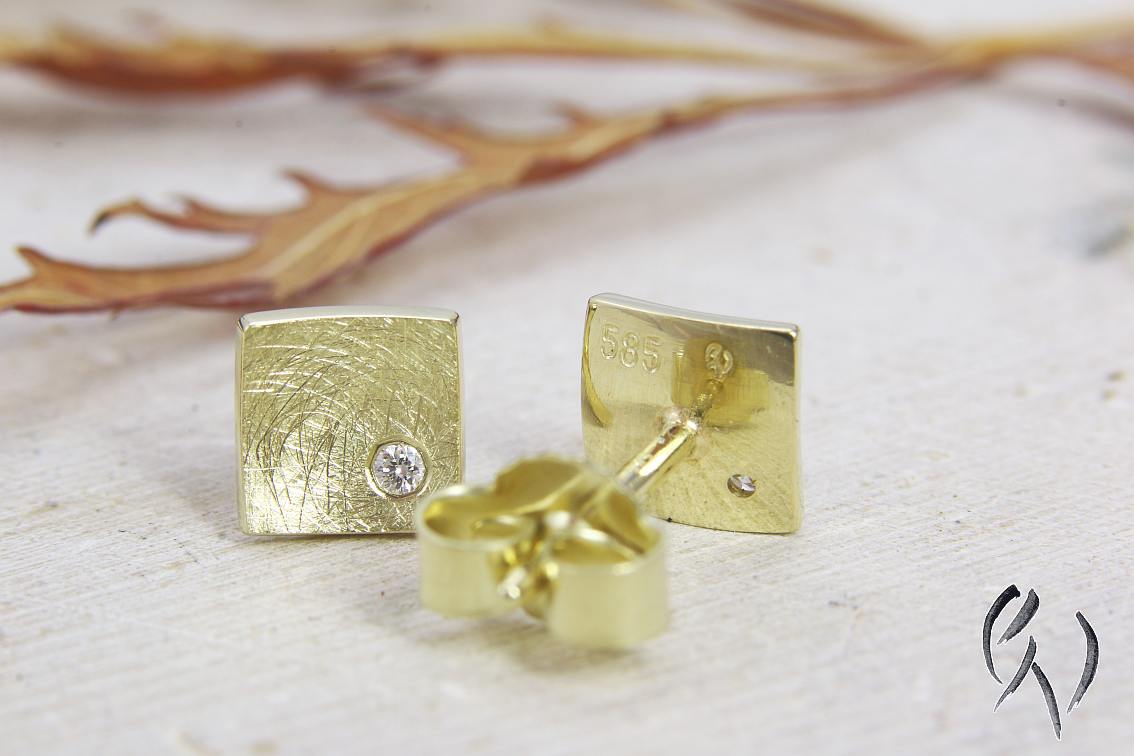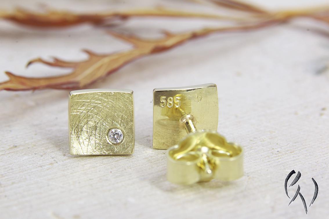 Bei diesen Ohrsteckern aus Gold 585/- ist die Fläche leicht nach innen gewölbt. Zusammen mit den polierten Kanten bildet die mattgekratzte Oberfläche einen schönen Kontrast und gibt diesen Ohrsteckern ein sehr edles Aussehen. Zusätzlich habe ich noch je einen kleinen Brillant in einer Ecke eingefasst.