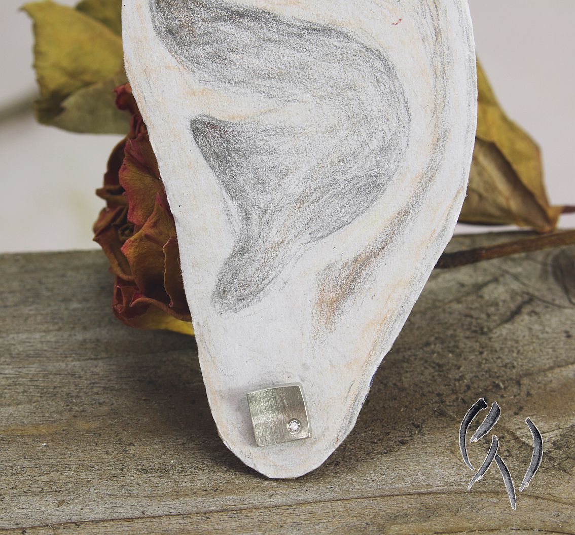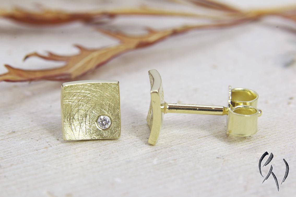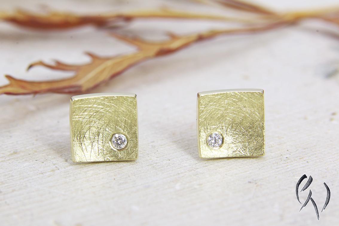 Bei diesen Ohrsteckern aus Gold 585/- ist die Fläche leicht nach innen gewölbt. Zusammen mit den polierten Kanten bildet die mattgekratzte Oberfläche einen schönen Kontrast und gibt diesen Ohrsteckern ein sehr edles Aussehen. Zusätzlich habe ich noch je einen kleinen Brillant in einer Ecke eingefasst.