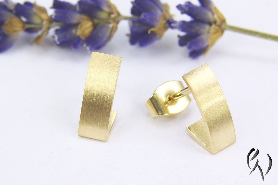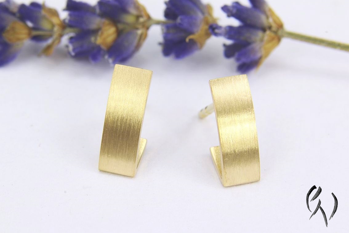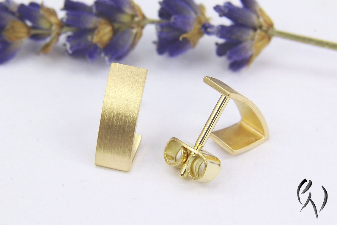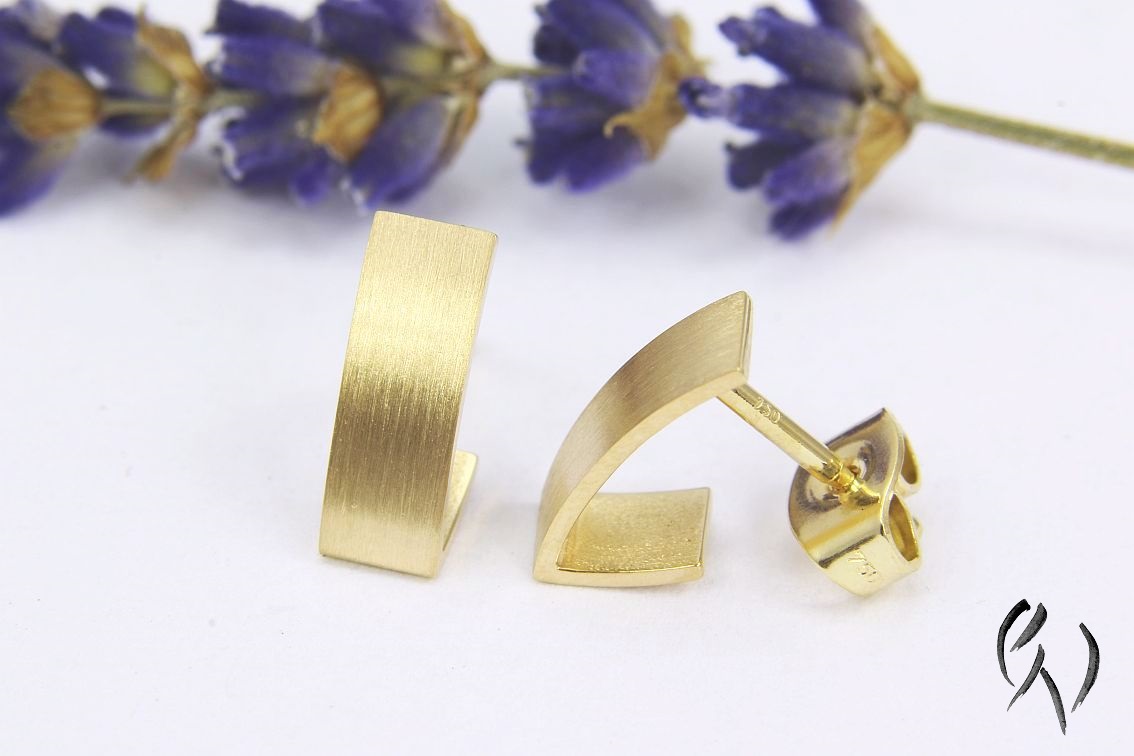 Ein schmaler Streifen aus Gold 750/- legt sich in einem sanften Bogen um das Ohrläppchen und knickt am unteren Ende nach hinten ab. Dadurch ergibt sich die Optik einer kleinen Creole.