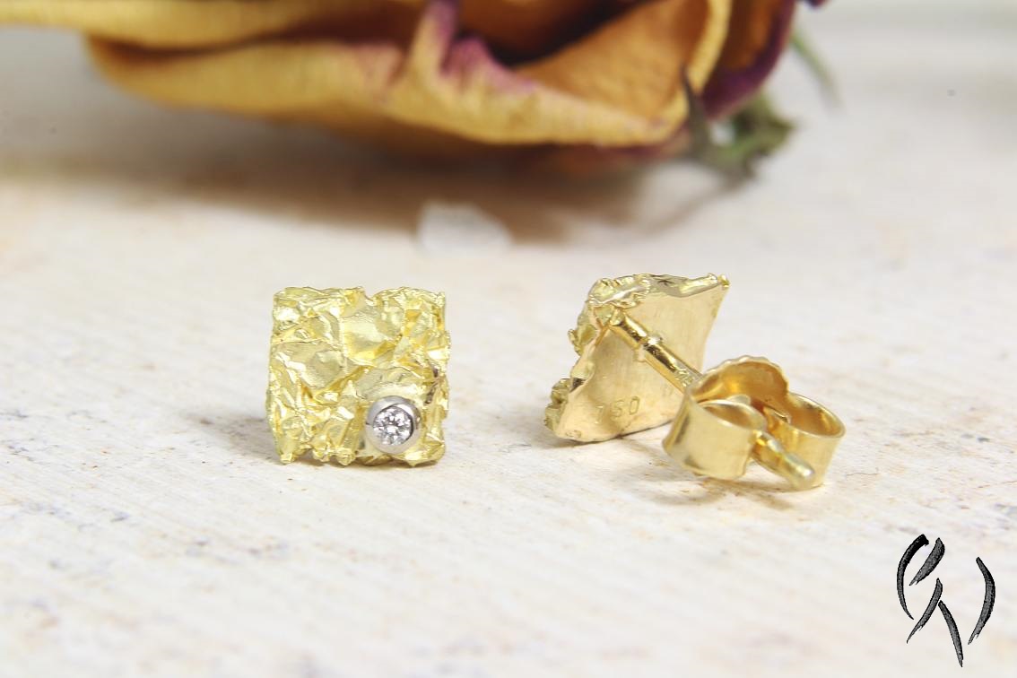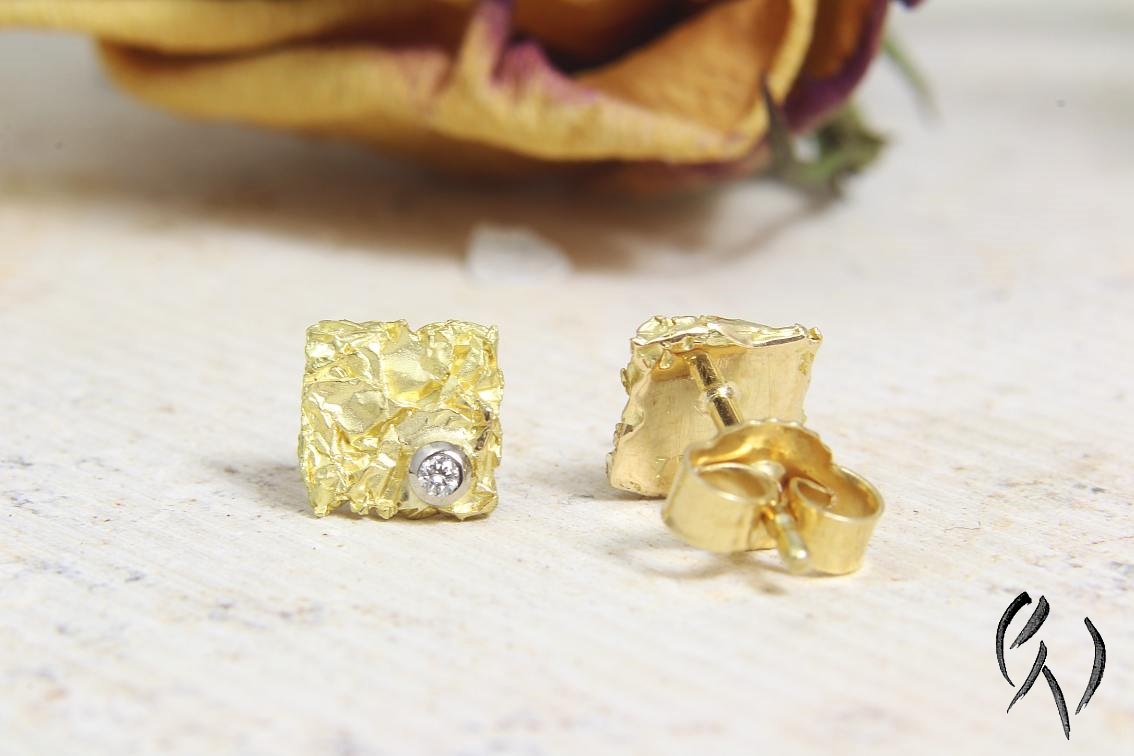 In einer Ecke der Quadrate mit der typischen, zerknitterten Struktur habe ich eine Fassung aus Weißgold 750/- aufgesetzt. Darin ist ein kleiner Brillant von 0,01 ct w/si eingefasst. Dieser Brillant verstärkt das Glitzern der Oberfläche und verschönert die (schon schönen) Stecker noch etwas mehr.