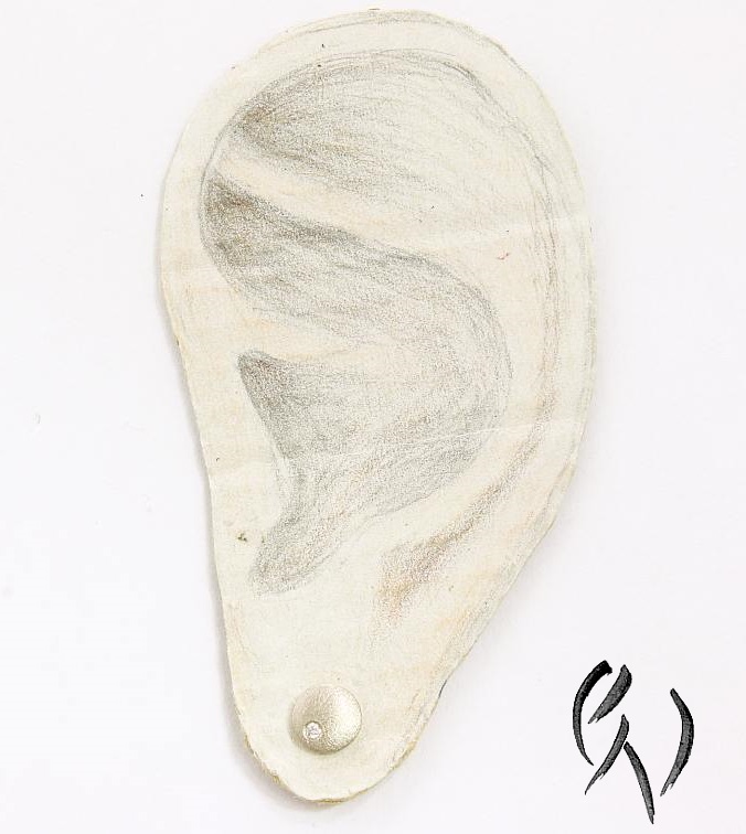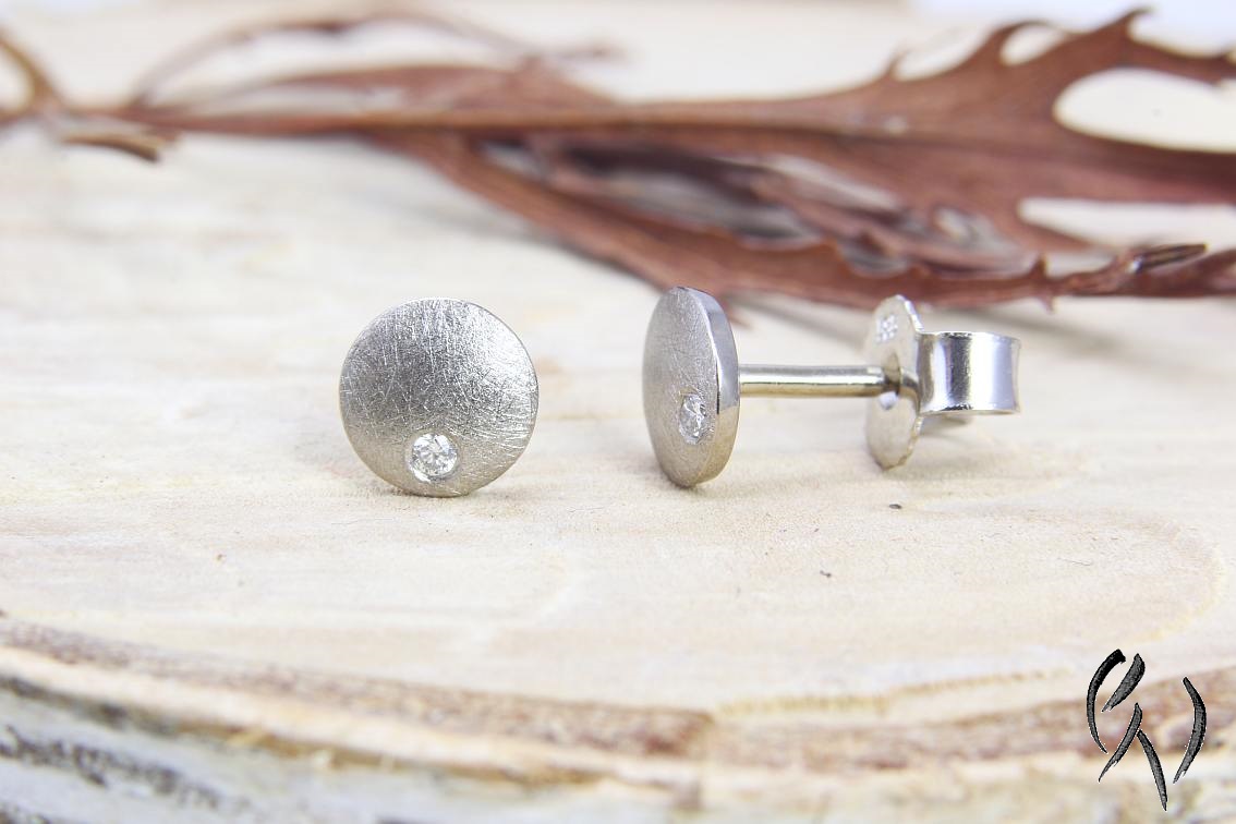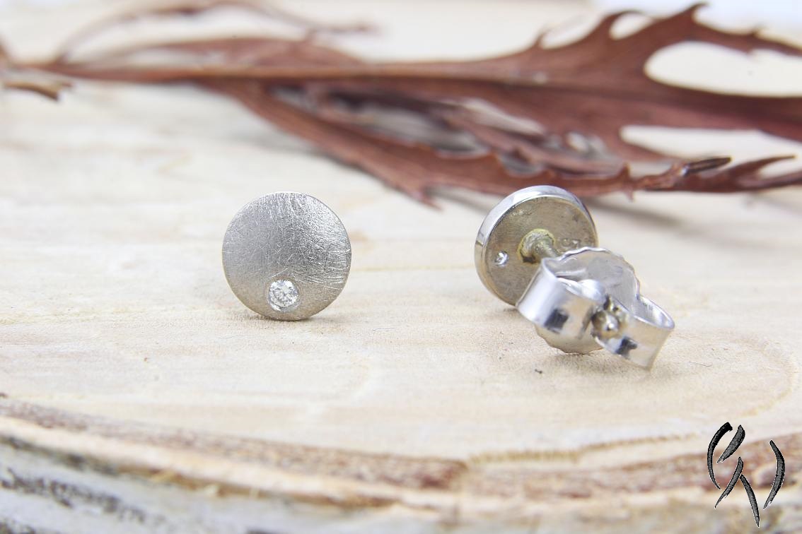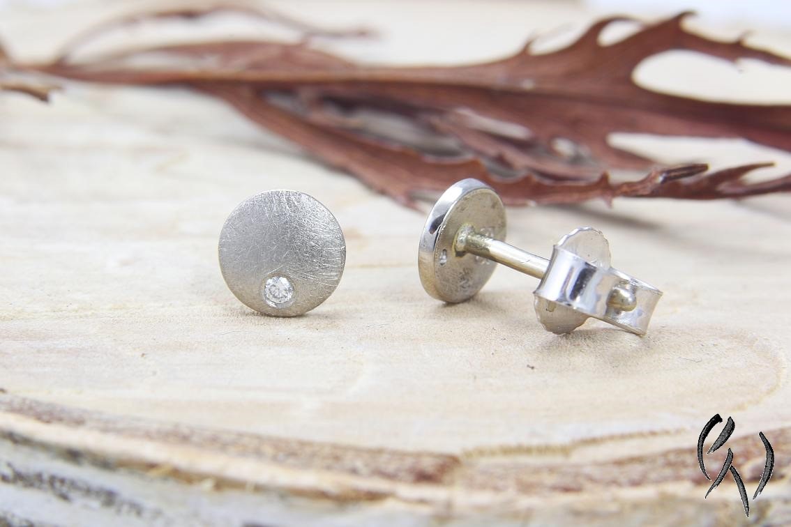 Die kleinen Scheiben leuchten in einem zarten Grauweiß wie der Vollmond am Nachthimmel. Wie eine Sternschnuppe, die kurz aufleuchtet, blitzt ein kleiner Brillant am Rand. Das alles habe ich mit diesen Ohrsteckern eingefangen.