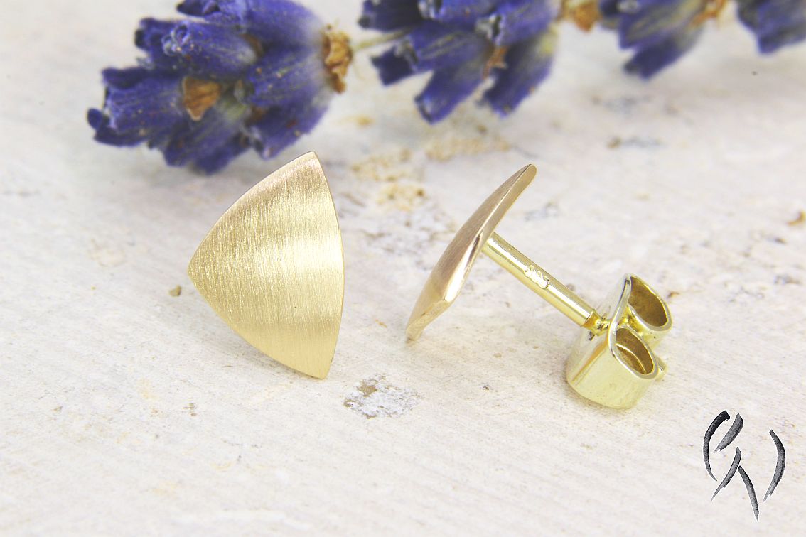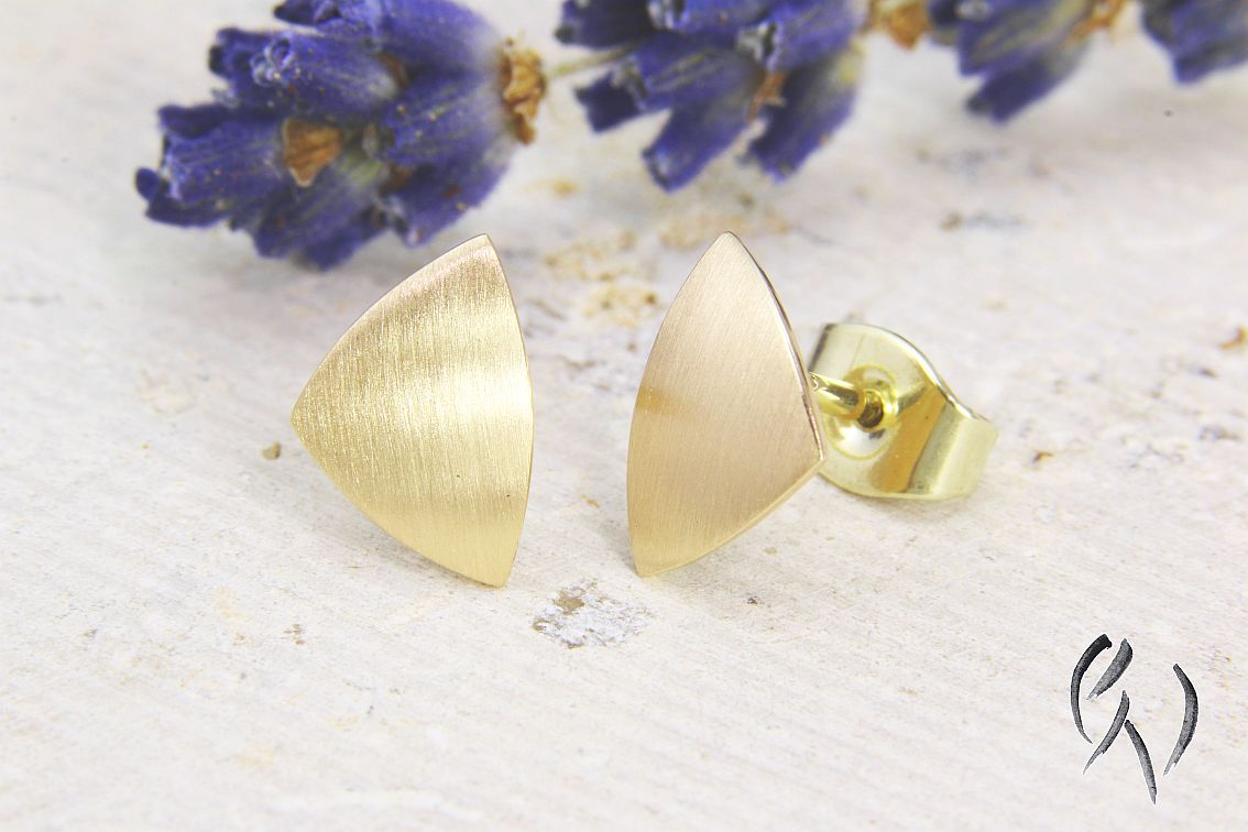 Dieses ist die etwas größere Ausführung meiner gleichschenkligen Dreieck-Ohrstecker. Trotzdem sind sie immer noch klein genug, um alltagstauglich zu sein, da sie im Allgemeinen nachts nicht herausgenommen werden müssen.