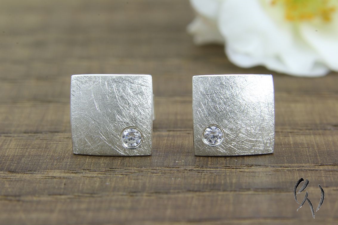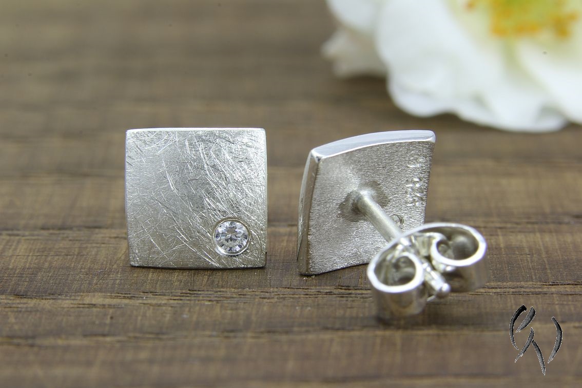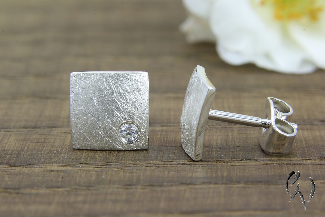 Diese Ohrstecker überzeugen durch das Zusammenspiel von Form und Struktur: Ein schlichtes Quadrat wurde hier kombiniert mit einer mattgekratzten Oberfläche. Zusätzlich habe ich in einer Ecke einen Zirkonia eingefasst. Das Ergebnis sind bezaubernde Ohrstecker für jede Gelegenheit.