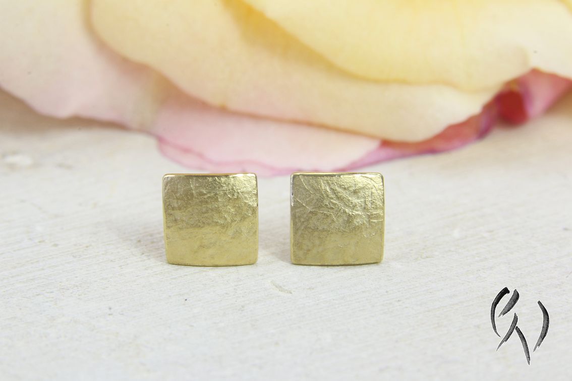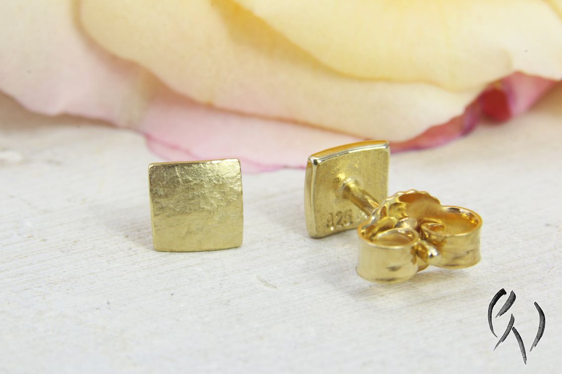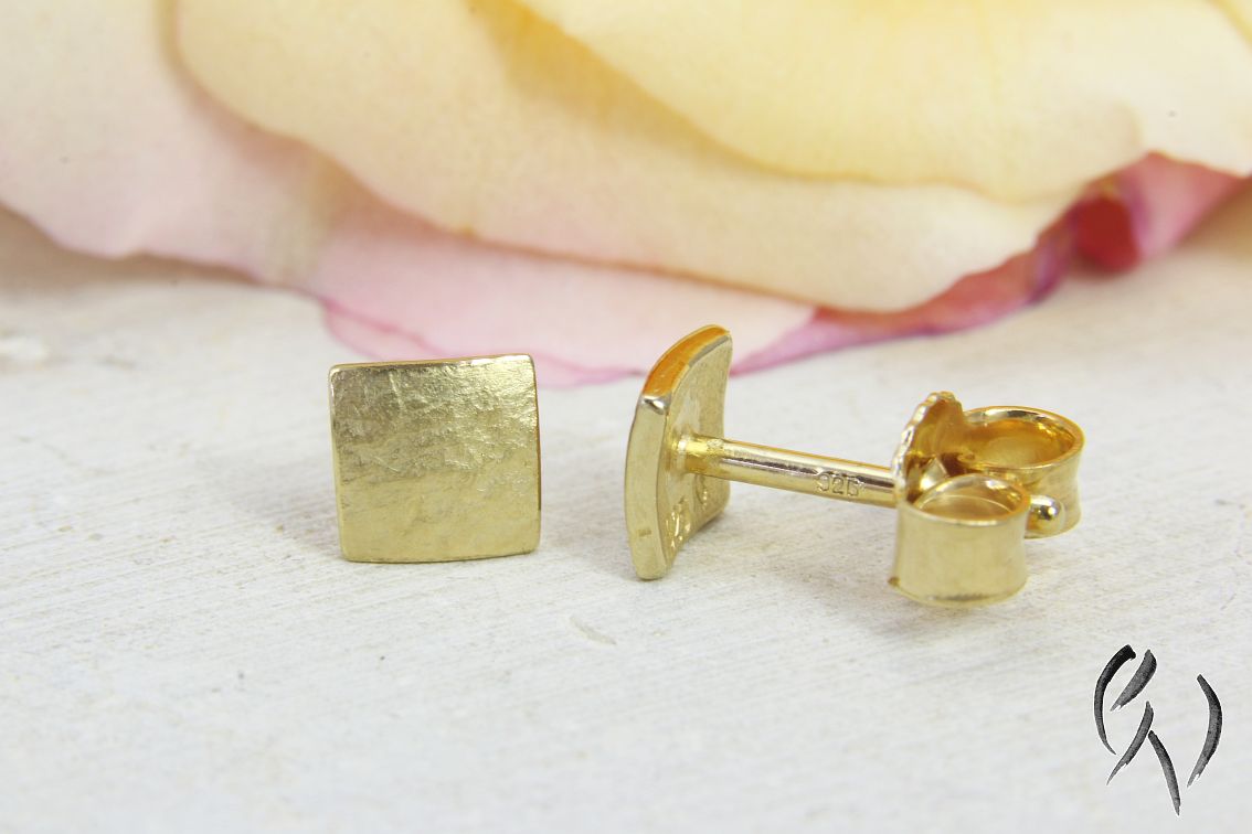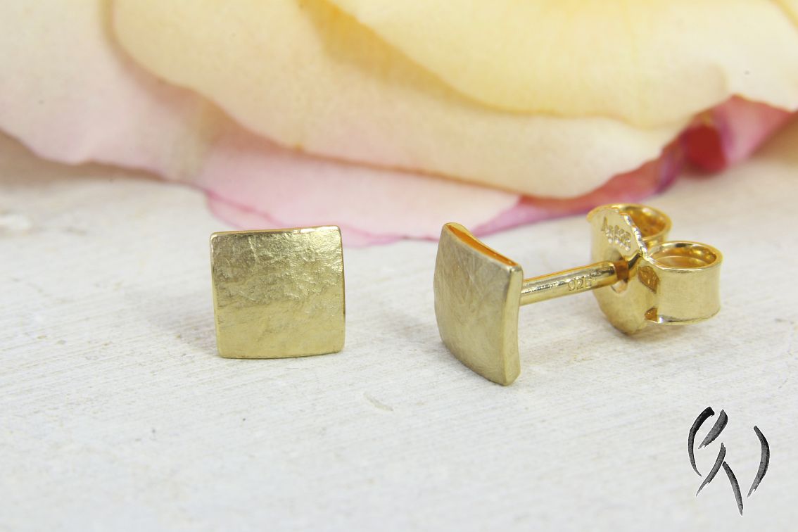Die Miniquadrate haben mit ihrer mattierten Oberfläche eine sehr schöne Wirkung am Ohr. Da sie so klein sind, muss man sie normalerweise nachts nicht herausnehmen, deshalb sind sie perfekt für jeden Tag. Diese Ohrstecker sind vergoldet, damit kann ich eine preisgünstige Alternative zu goldenen Ohrsteckern anbieten.