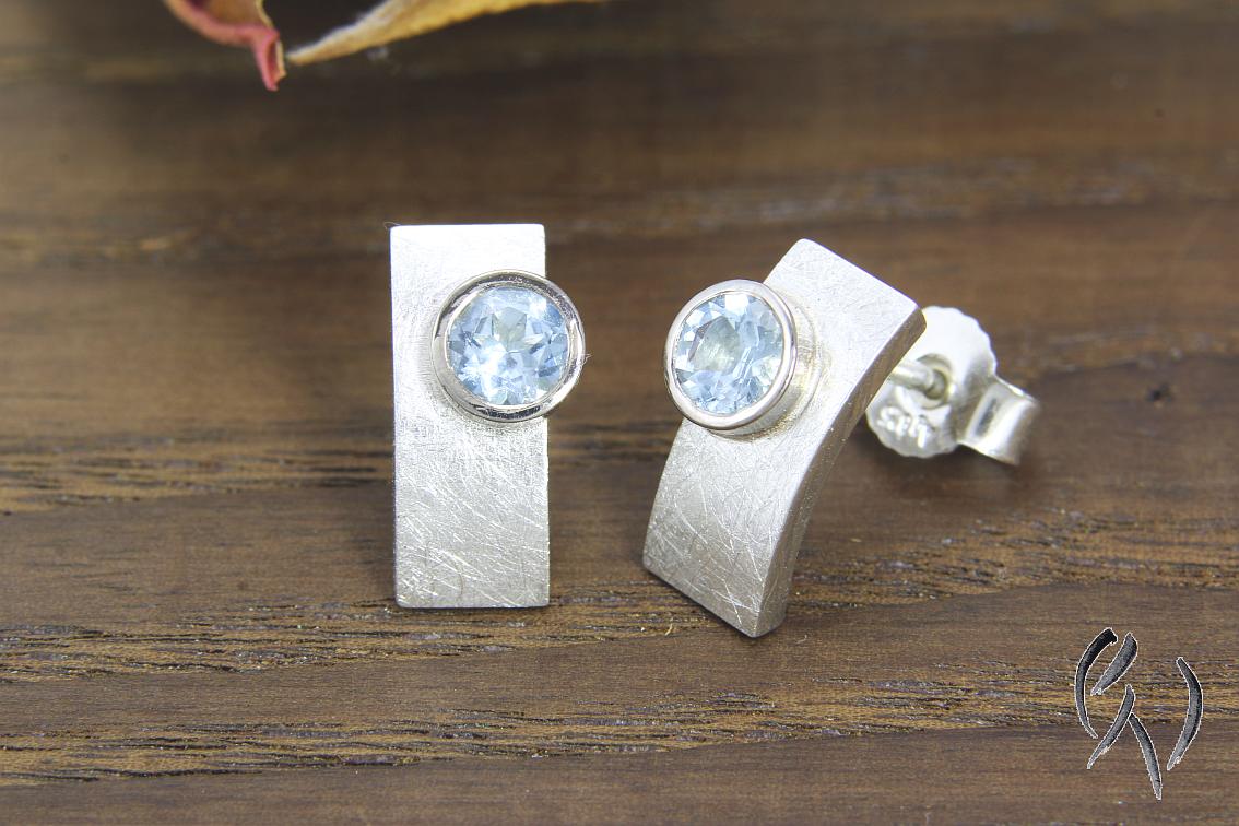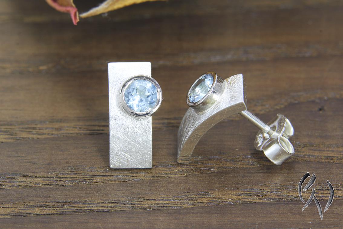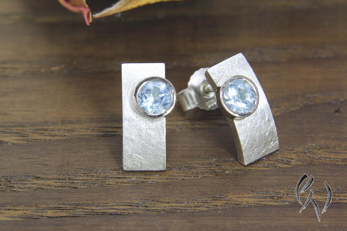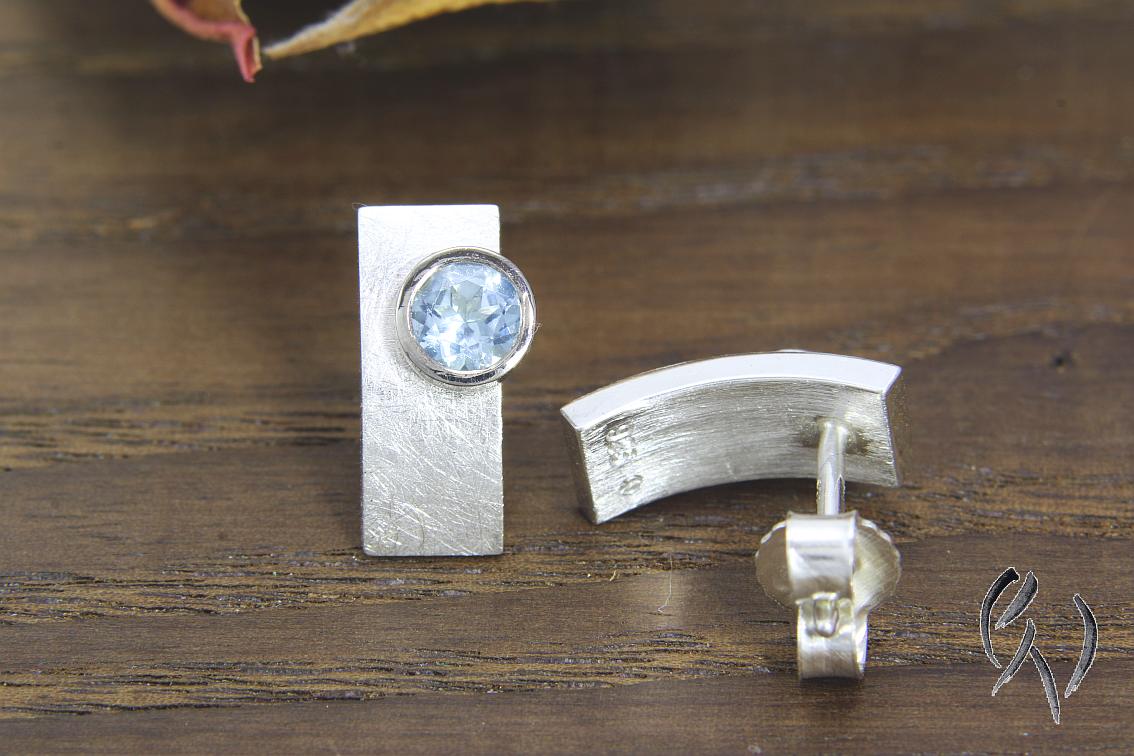 Diese Ohrstecker passen zu meinen Ringen mit den seitlich verschobenen Steinen: Auf einen schmalen, leicht gebogenen Streifen aus Silber habe ich eine Fassung aus Weißgold aufgesetzt. In dieser Fassung ist ein Aquamarin eingefasst.