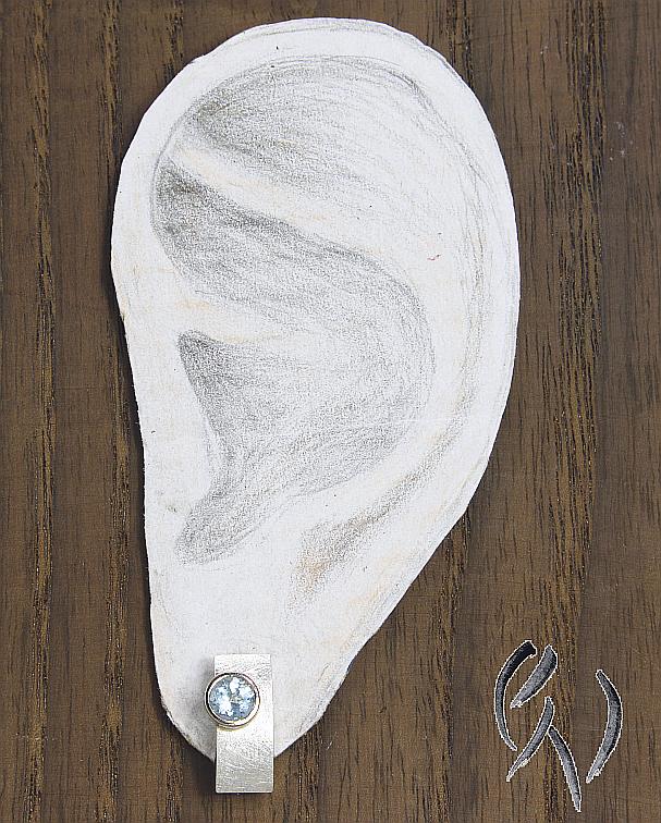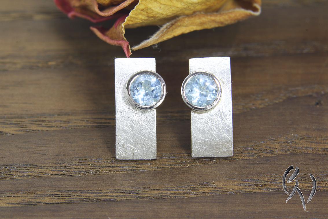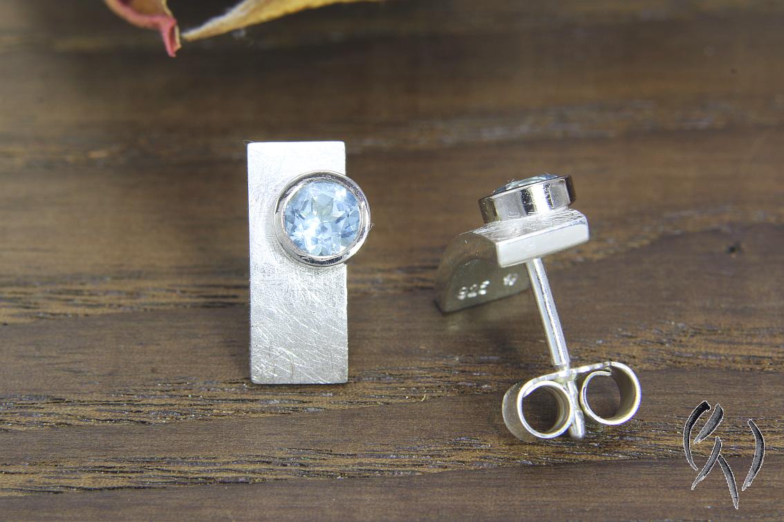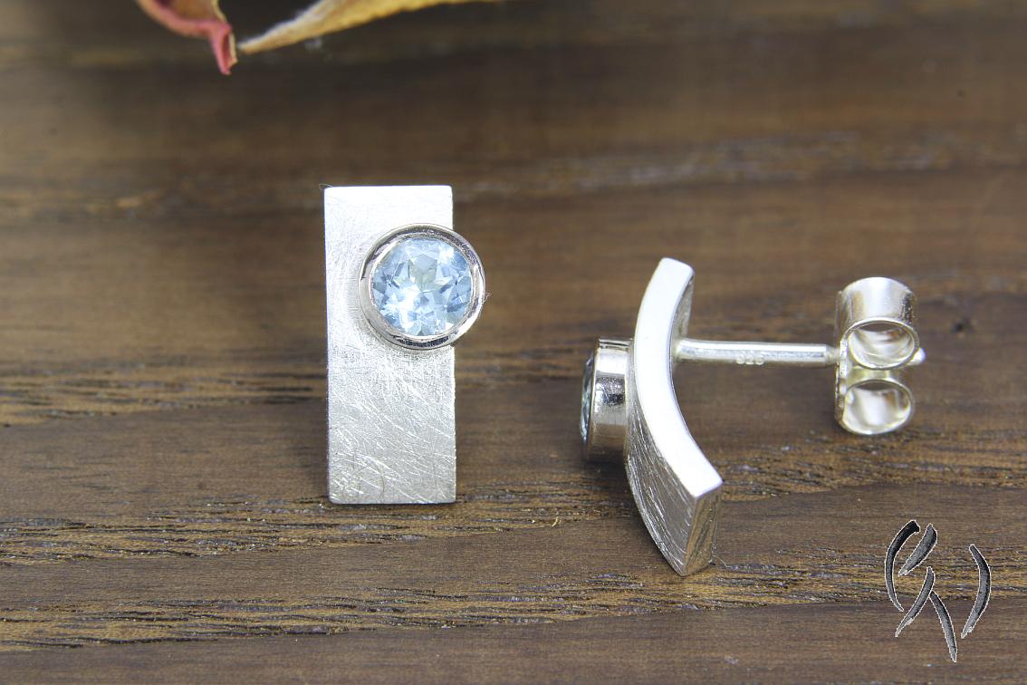 Diese Ohrstecker passen zu meinen Ringen mit den seitlich verschobenen Steinen: Auf einen schmalen, leicht gebogenen Streifen aus Silber habe ich eine Fassung aus Weißgold aufgesetzt. In dieser Fassung ist ein Aquamarin eingefasst.