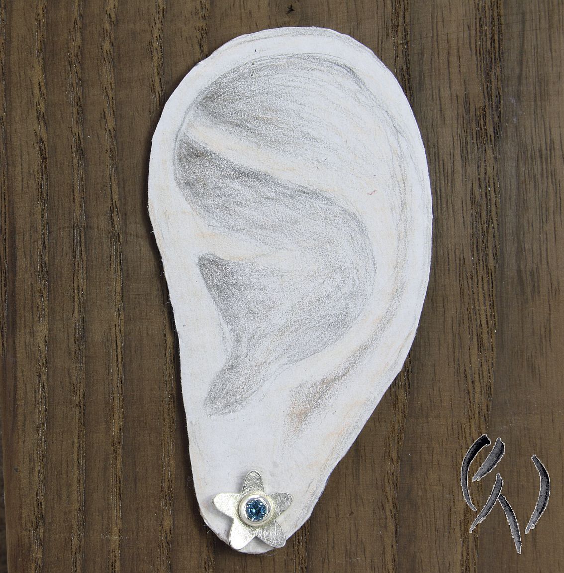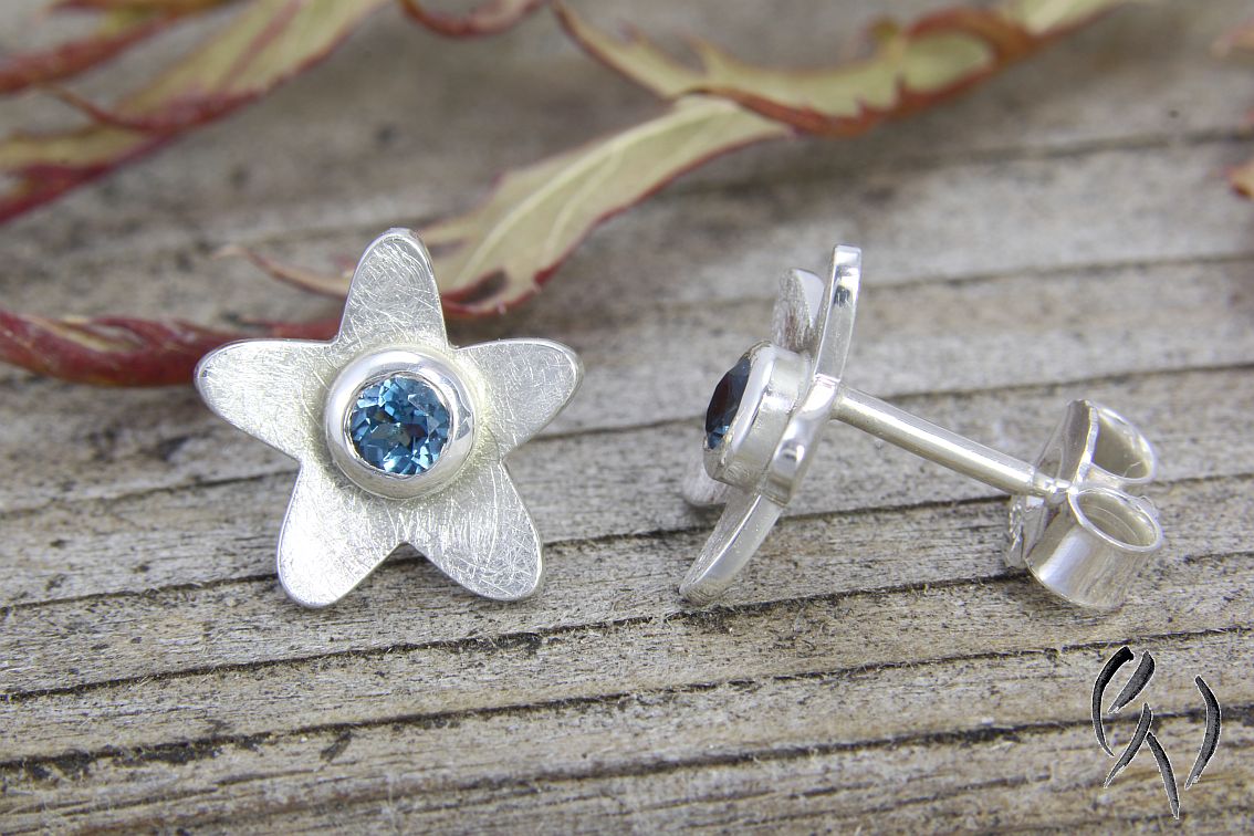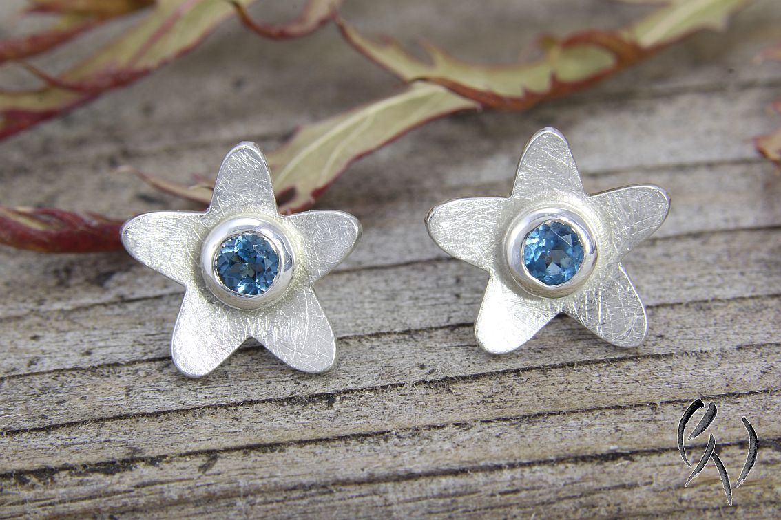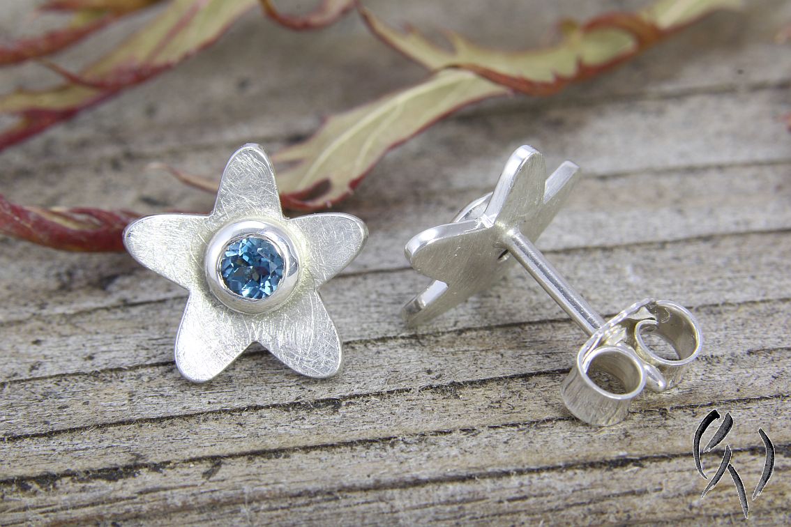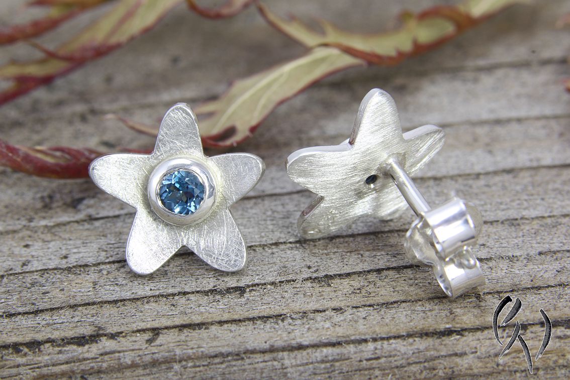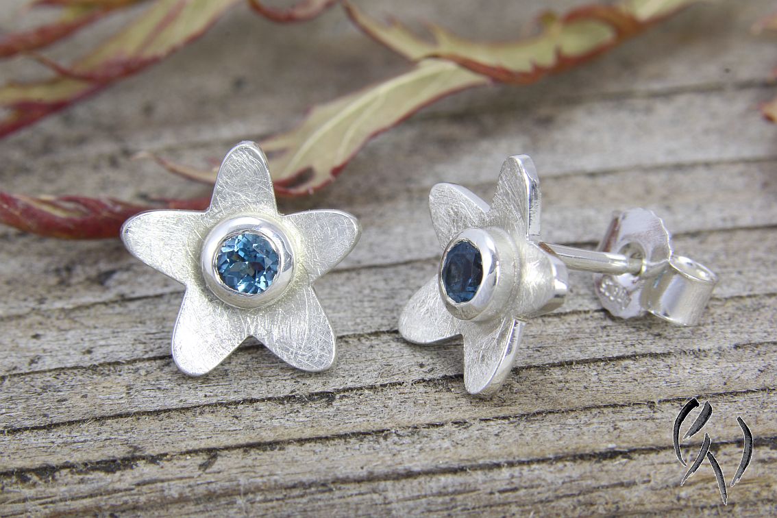 In der Mitte der Blüten habe ich einen Topas in einem schönen, leuchtenden Blau eingefasst.