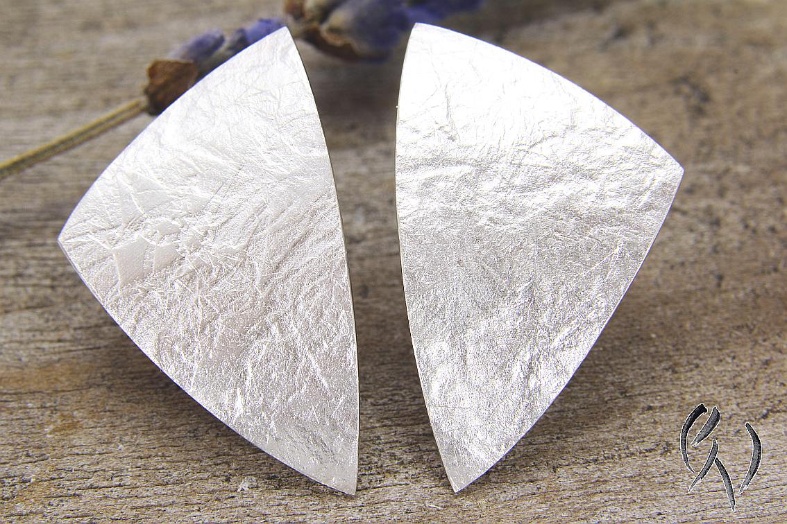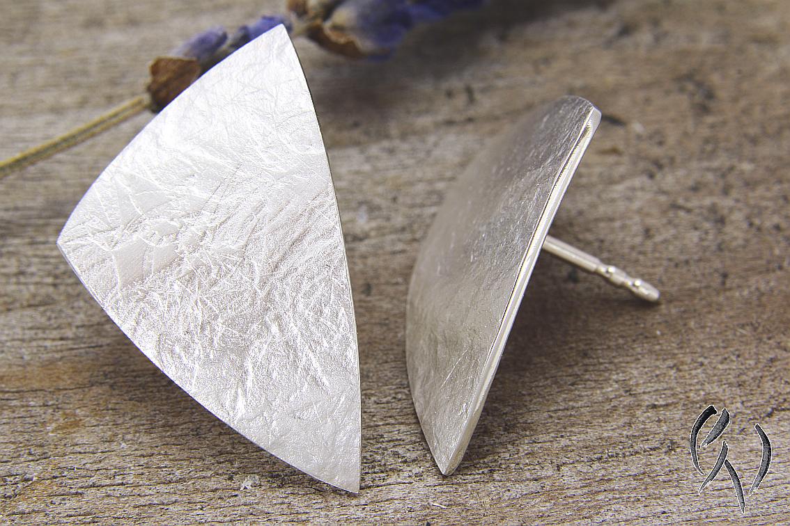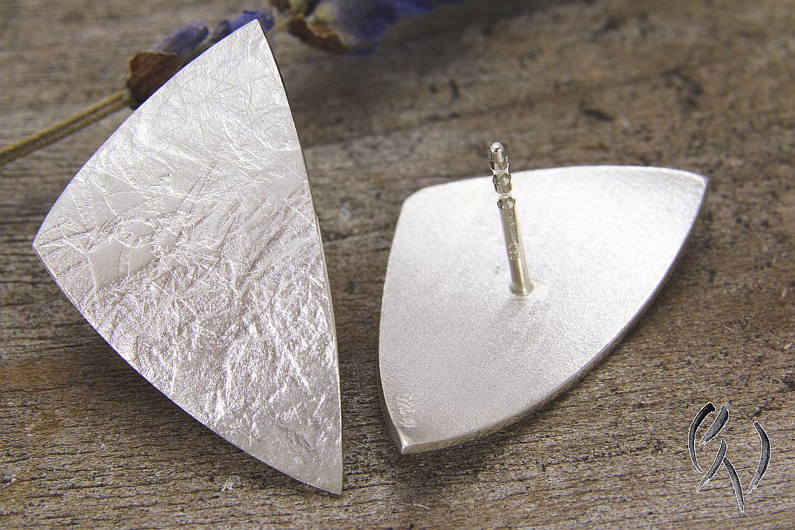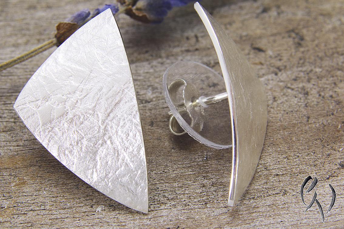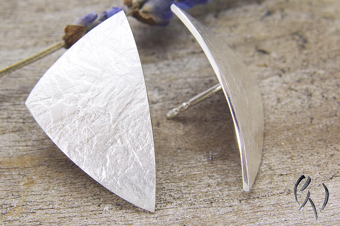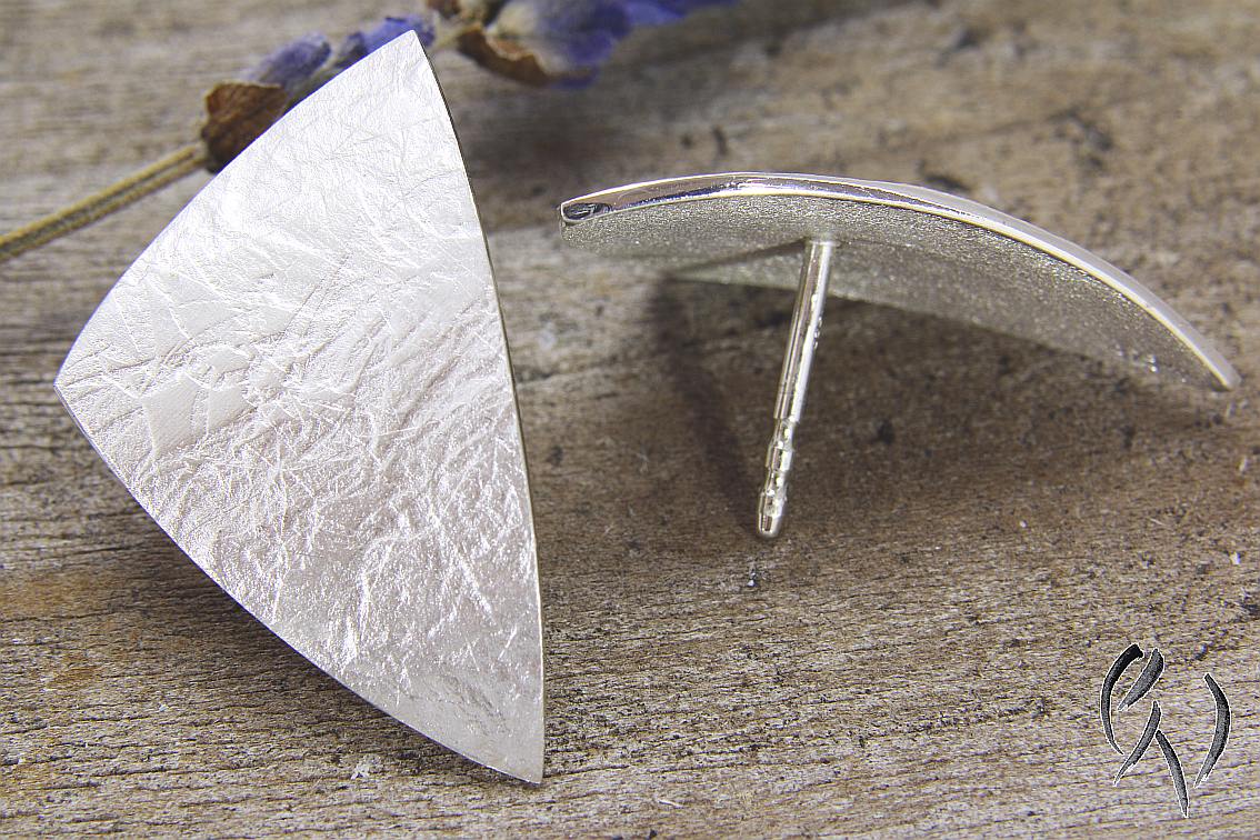 Die Ohrstecker sind leicht gebogen und haben eine papierstrukturierte Oberfläche. Die Außenkanten sind poliert.