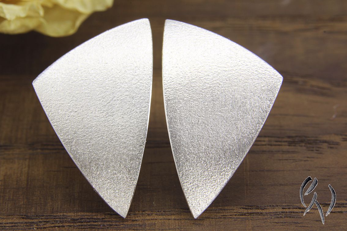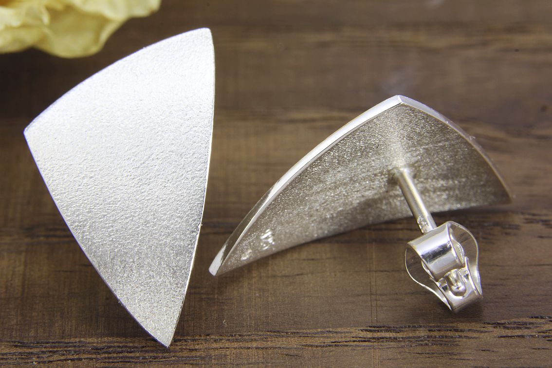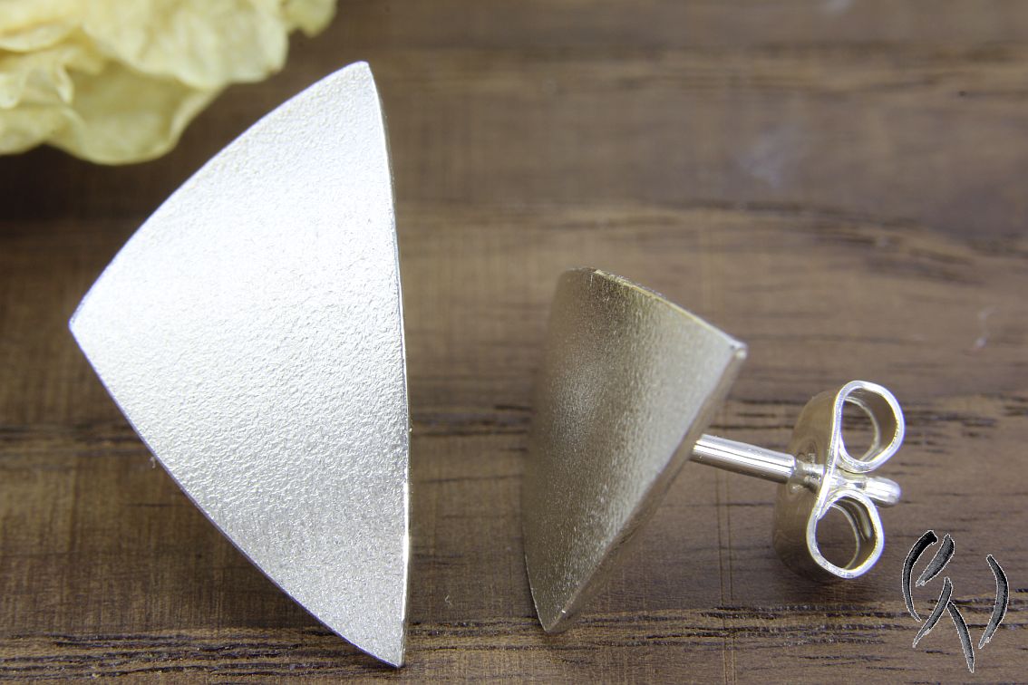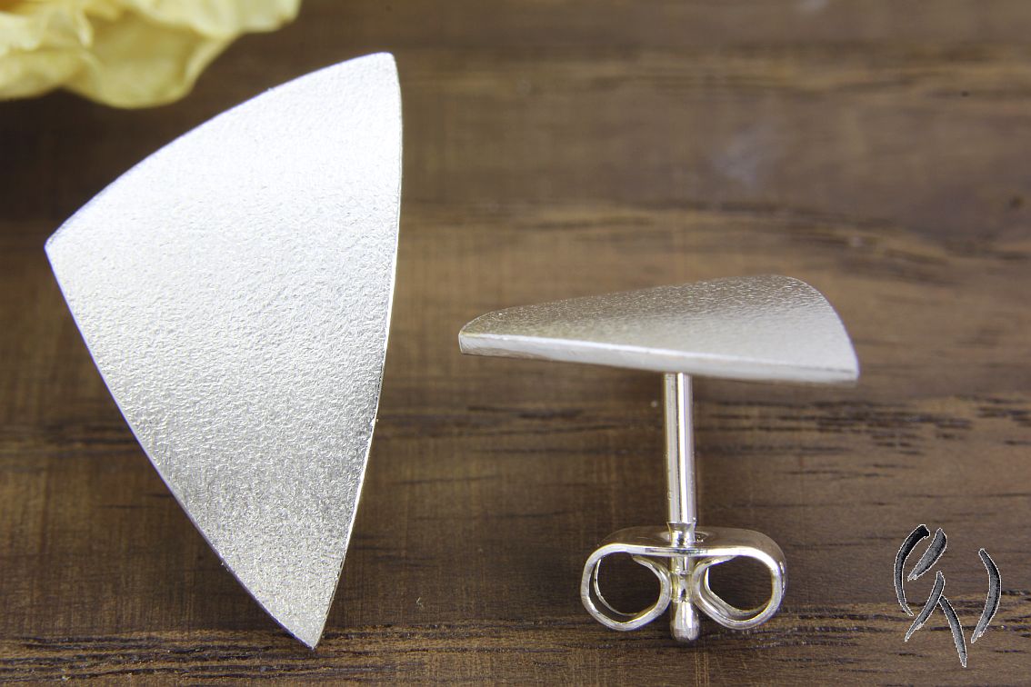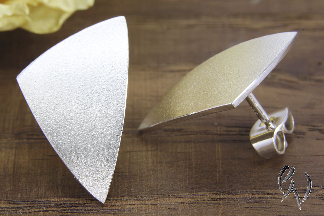 Die Ohrstecker sind leicht gebogen und haben eine mattgeschlagene Oberfläche. Die Außenkanten sind poliert.