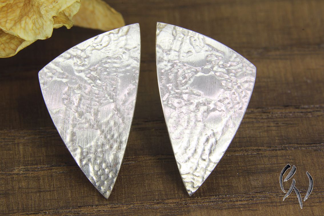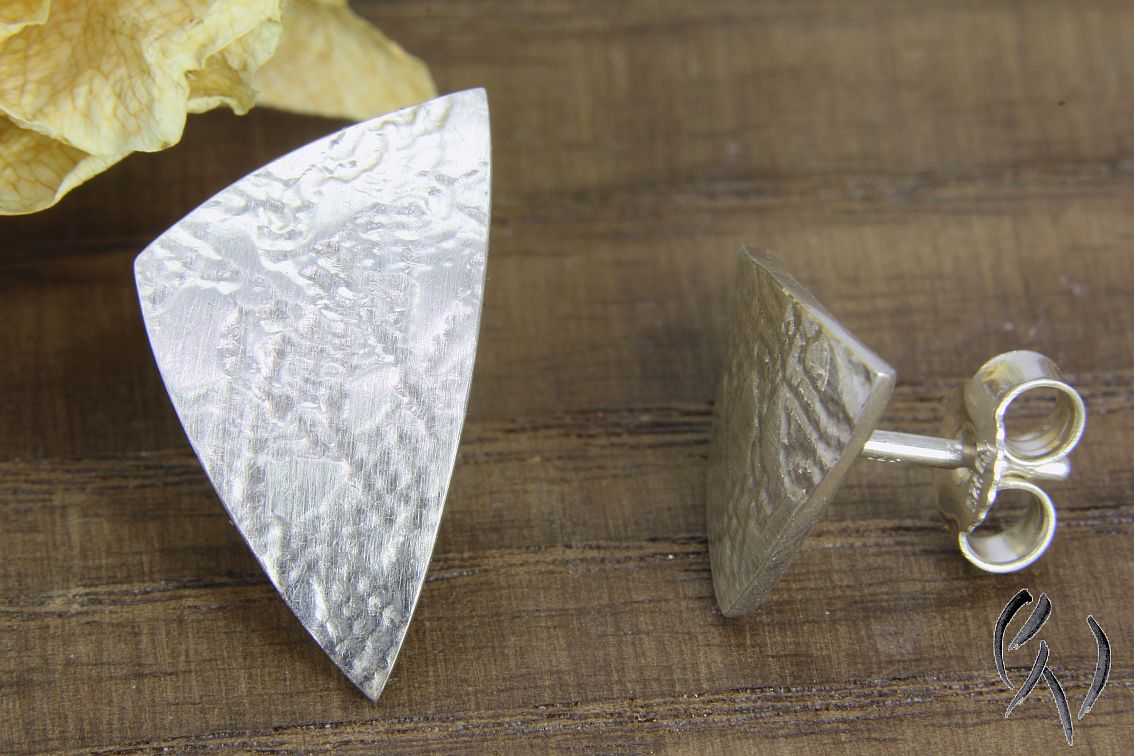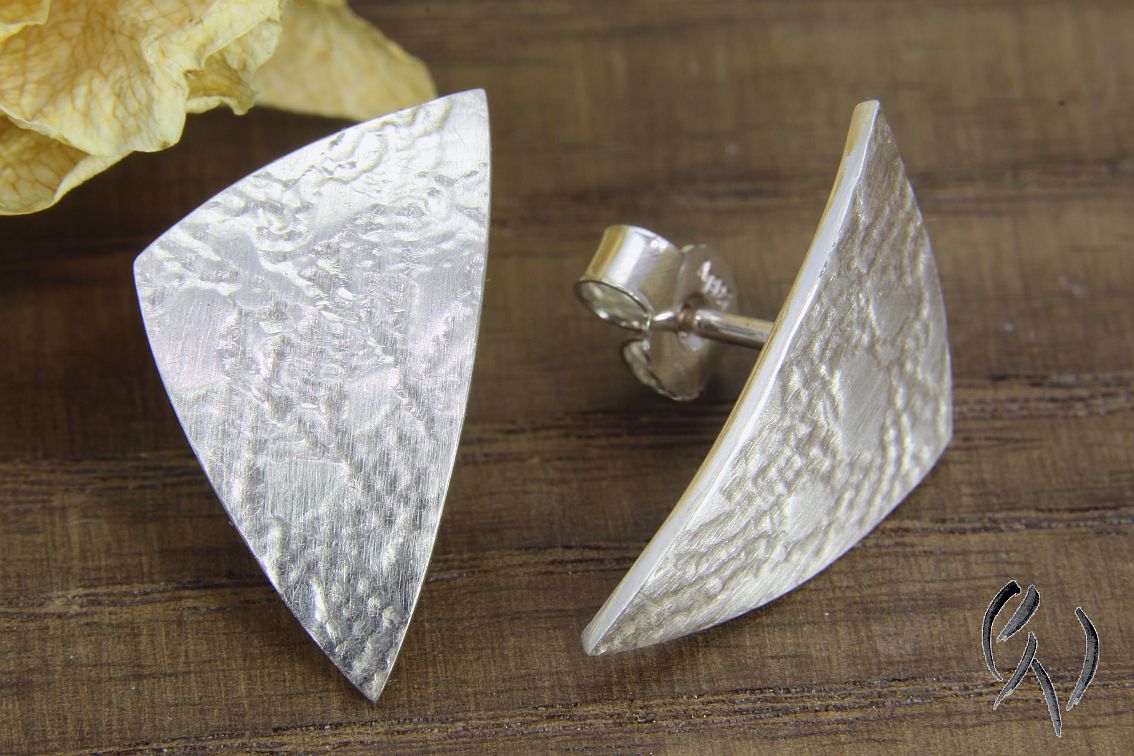 Die Ohrstecker sind leicht gebogen und haben eine spitzenstrukturierte Oberfläche. Die Außenkanten sind poliert.