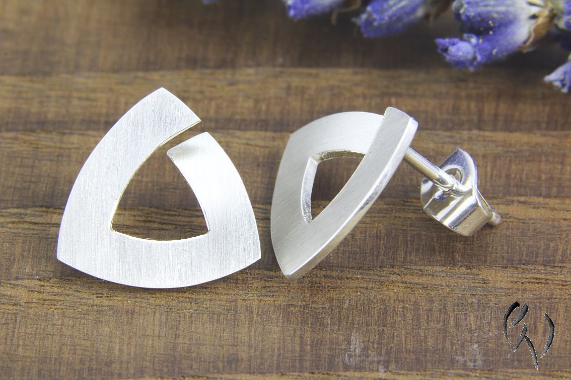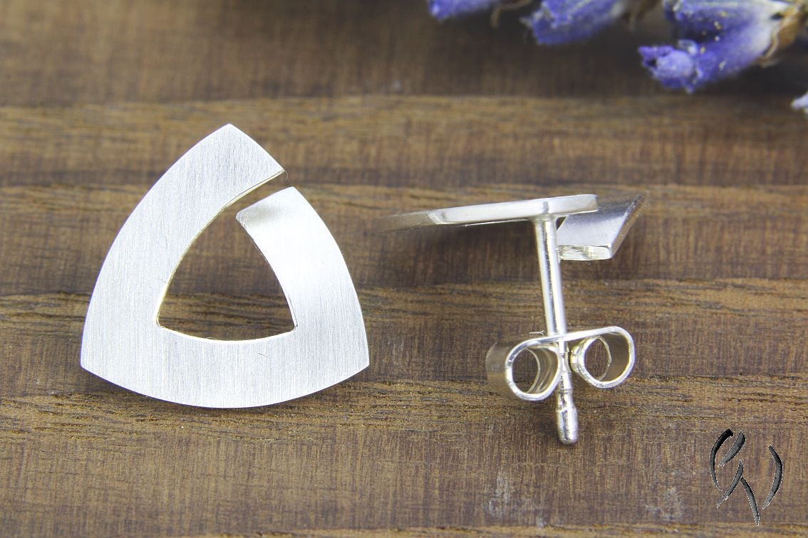Wie bei dem bekannten Instrument ist das Dreieck dieser Ohrstecker an einer Seite offen. Der äußere Bogen ist leicht nach hinten gebogen, läuft aber bei dieser kleinen Ausführung nicht hinter das Ohrläppchen.