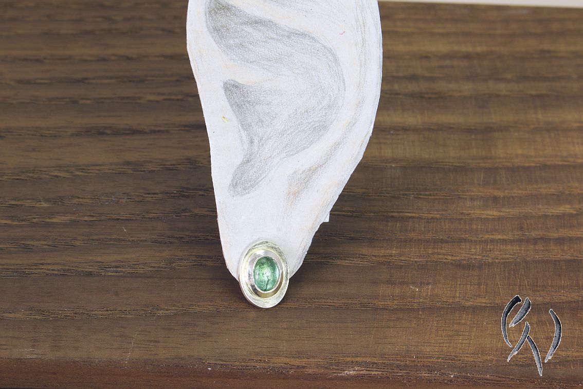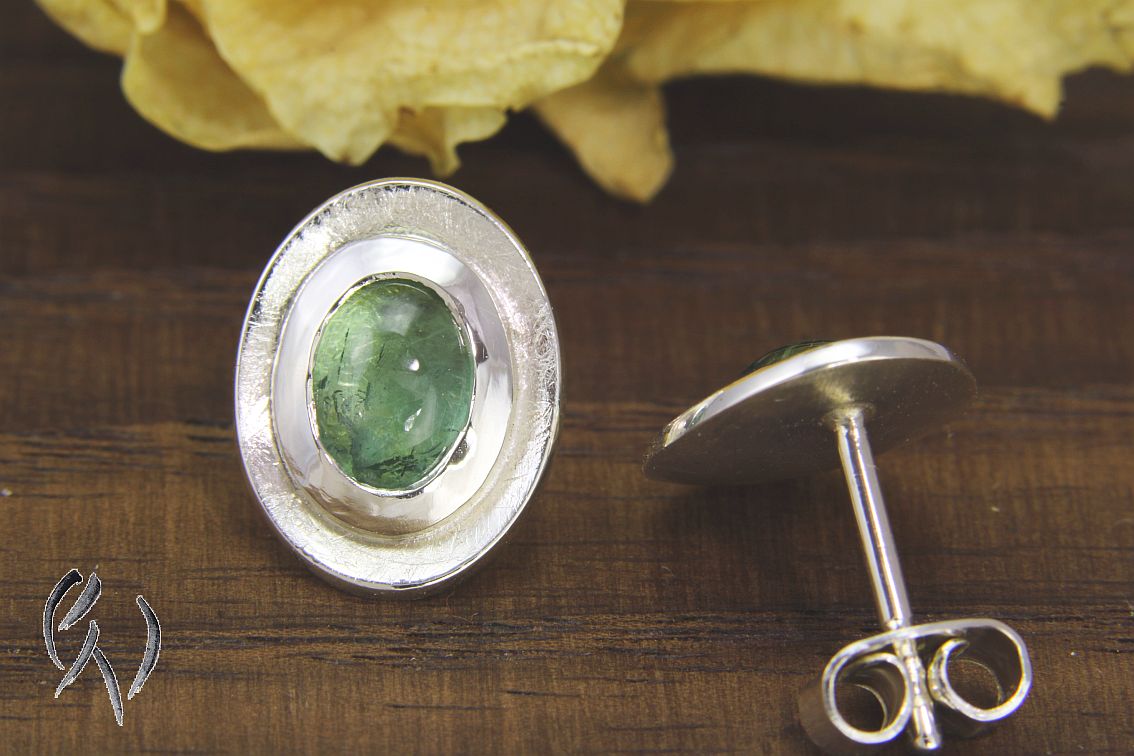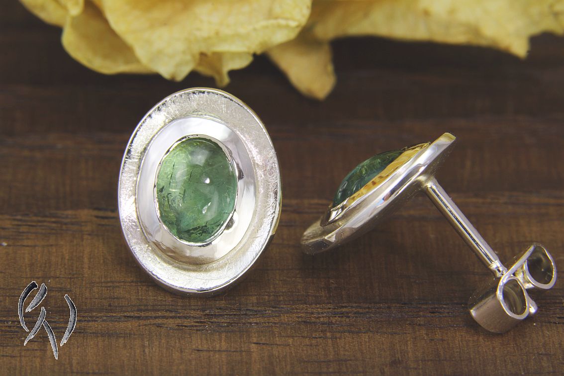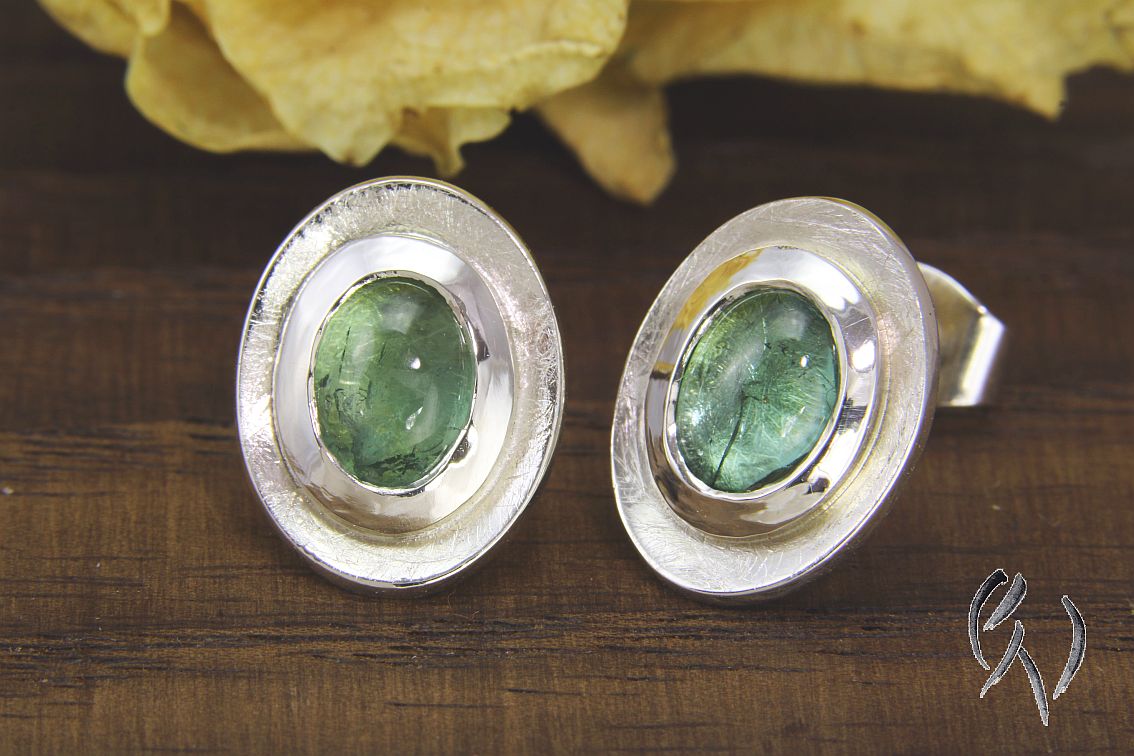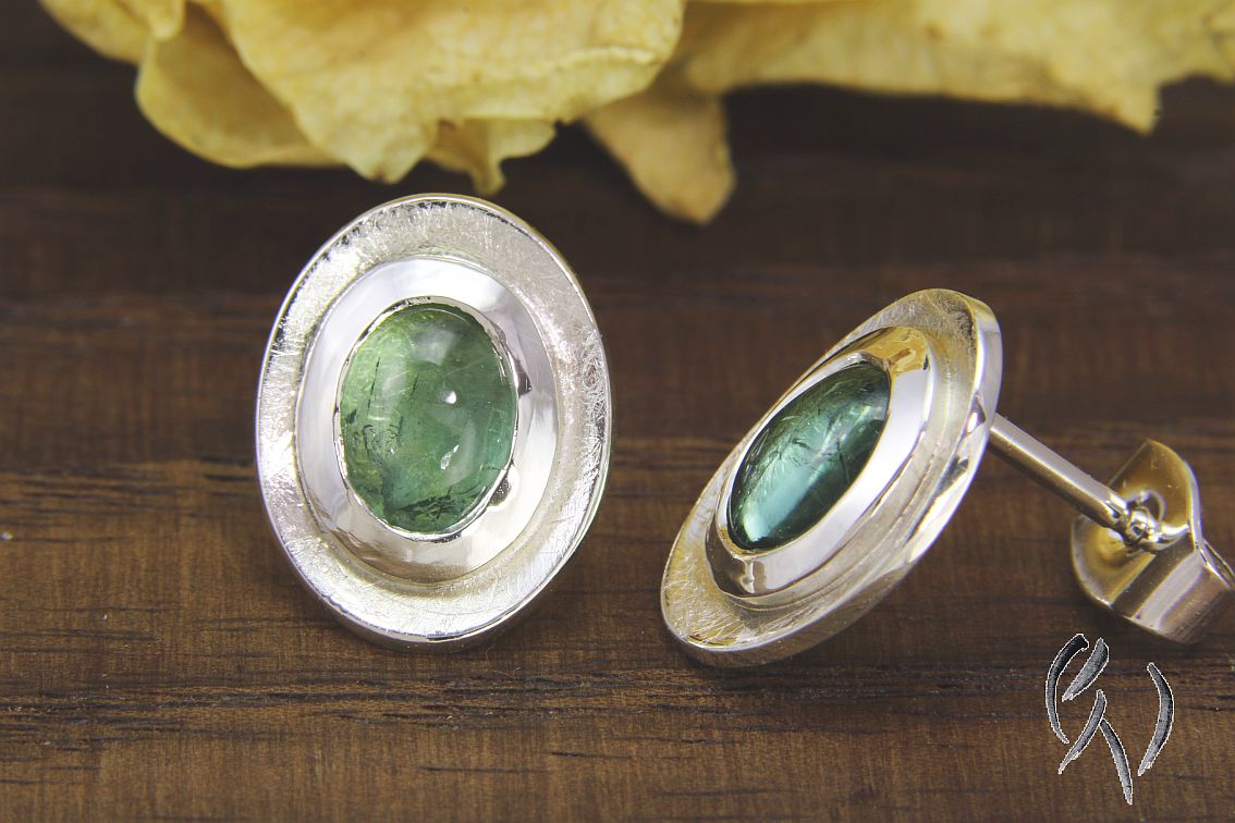 Die ovalen Scheiben sind leicht konkav aufgetieft und haben eine mattgekratzte Oberfläche. In die Mitte der Scheiben habe ich eine dicke, polierte Fassung aus Silber aufgesetzt. Darin ist ein hellblauer Turmalin im Cabochonschliff eingefasst.