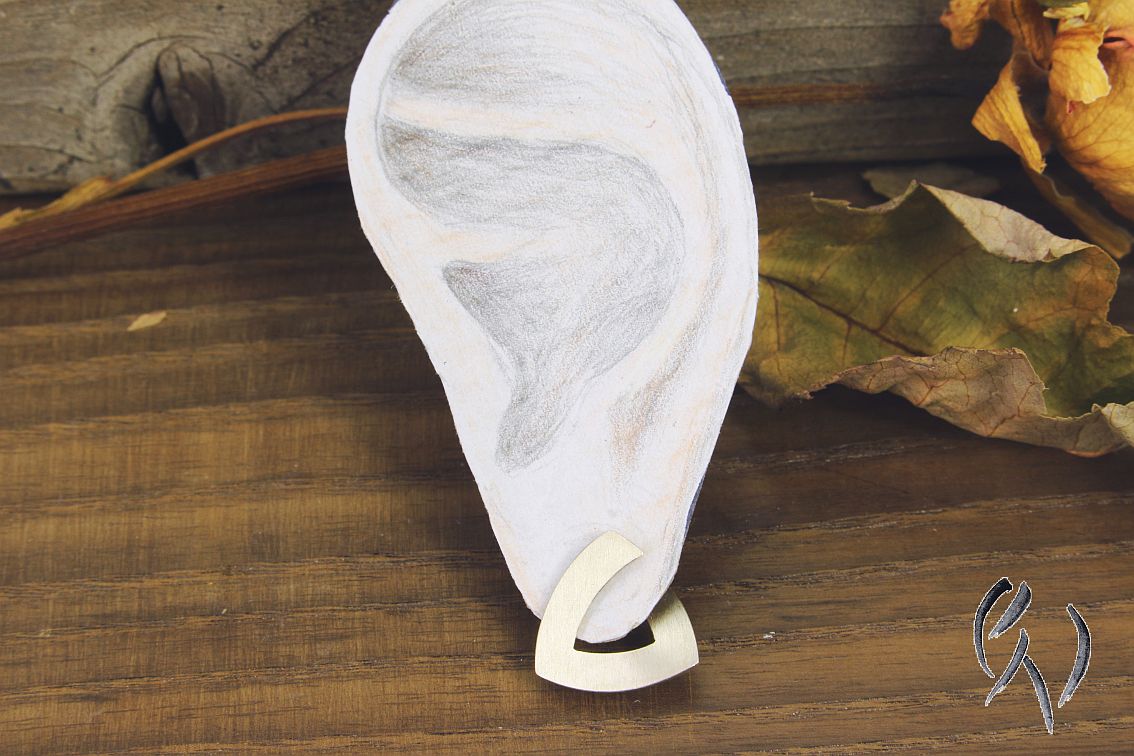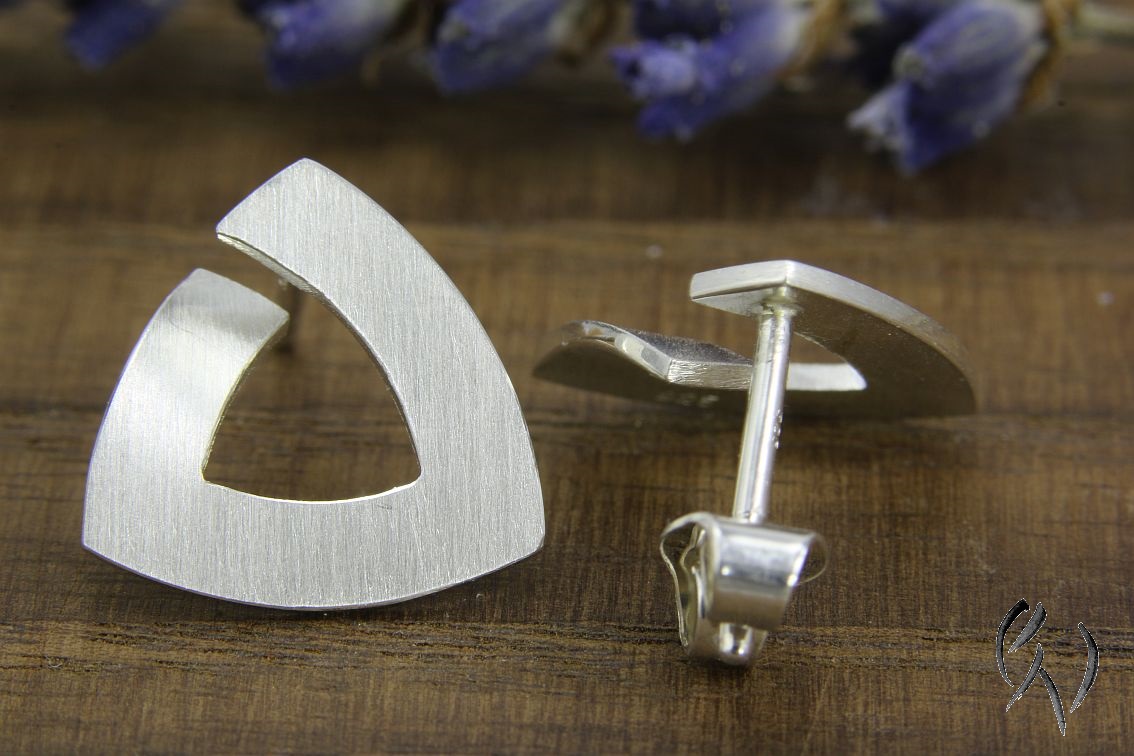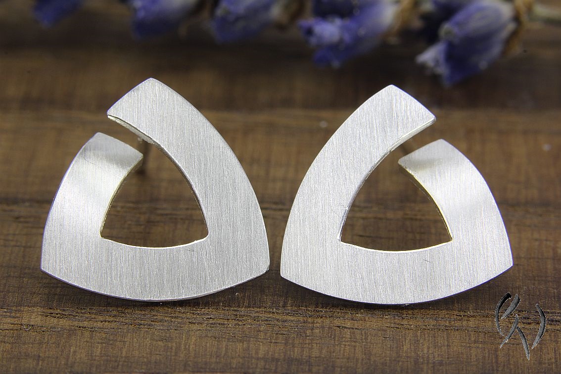 Wie bei dem bekannten Instrument ist das Dreieck dieser Ohrstecker an einer Seite offen. Der äußere Bogen ist leicht nach hinten gebogen und kann hinter das Ohrläppchen geführt werden.