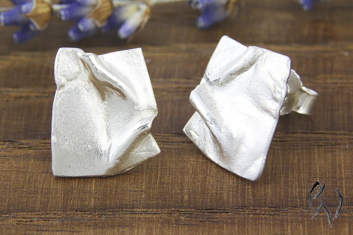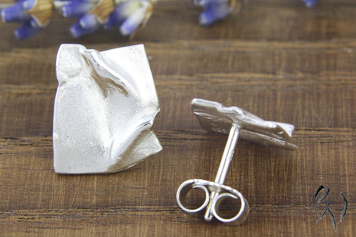 Die unregelmäßig strukturierte Flächen dieser rechteckigen Ohrstecker erinnnern an Wellen, die an den Strand spülen. Die Wellenkämme sind hier poliert, und in den Tiefen zeigt sich eine feine Struktur.