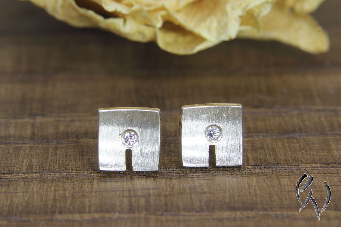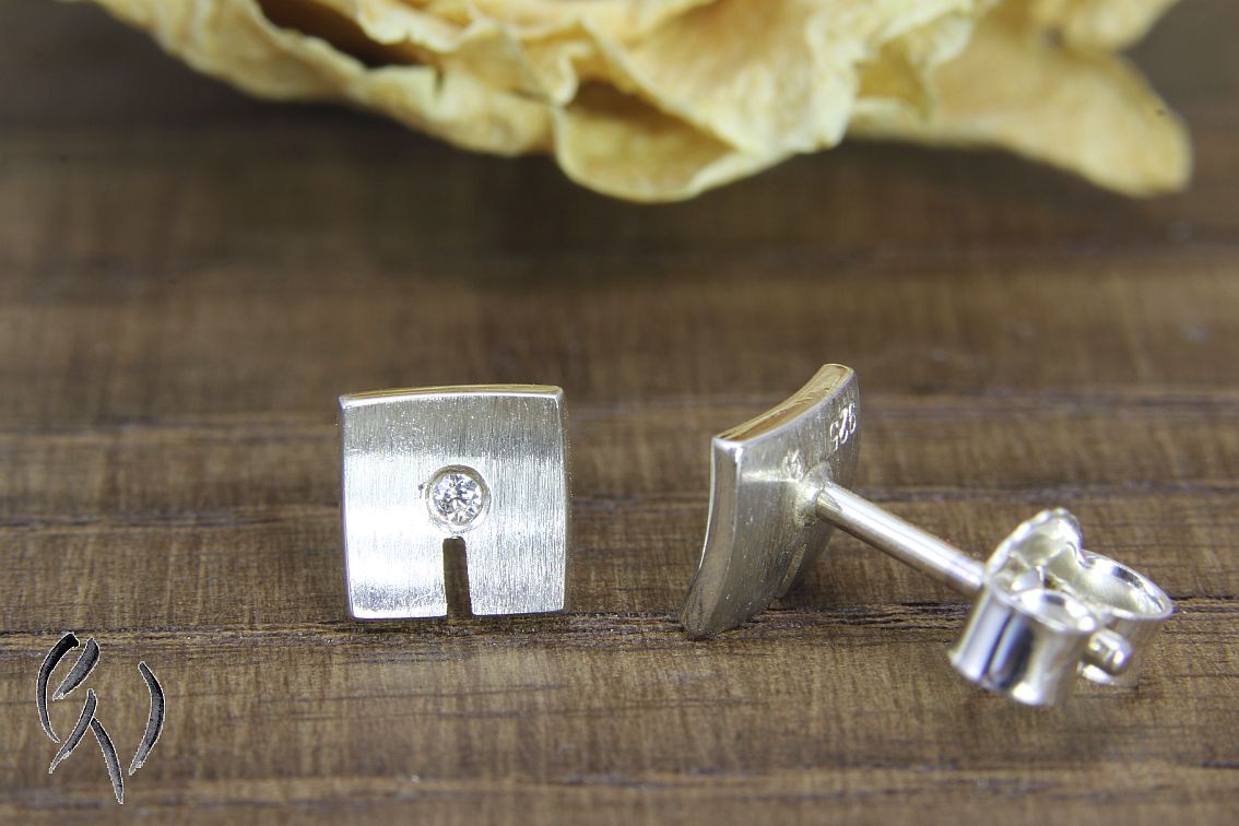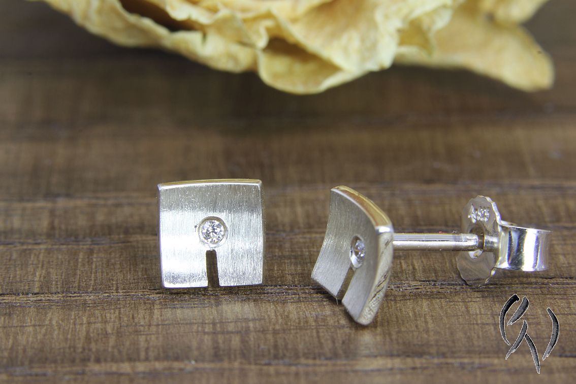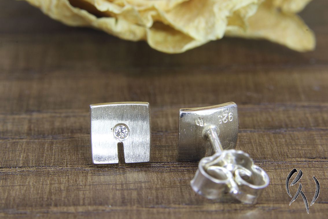 Bei diesen Ohrsteckern aus Silber ist die Fläche leicht nach innen gewölbt. In der Mitte habe ich einen kleinen Zirkonia eingefasst. Darunter ist ein Streifen eingesägt.