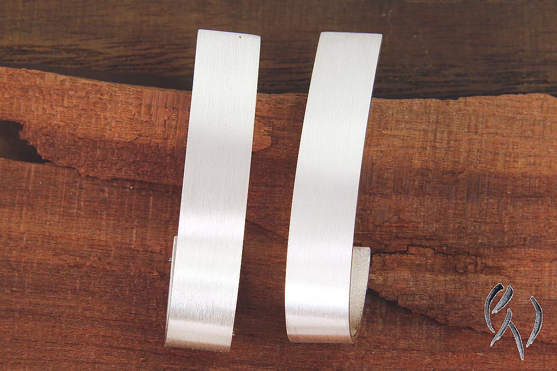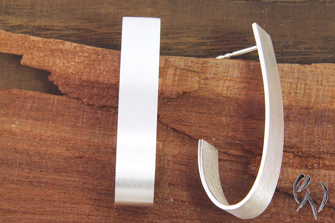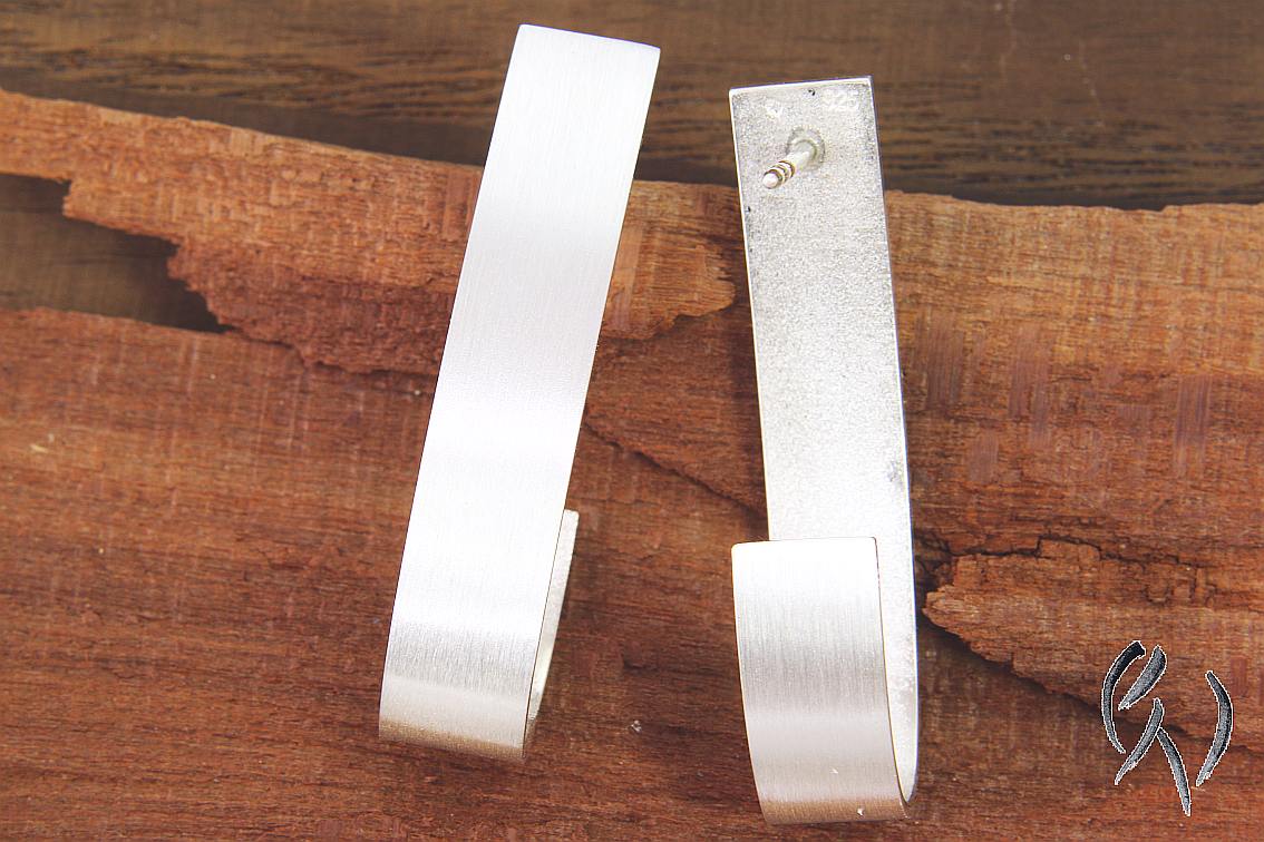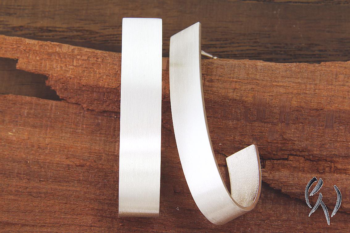 Schlichte, aber doch auffällige Ohrstecker aus Silber 925/-.Sie schwingen sich in einem langen Bogen vom Ohrläppchen nach unten und wieder nach oben.