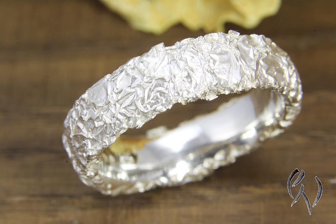Wie bei allen Ringen dieser Serie hat auch dieser eine Oberfläche, die wie zerknitterte Folie aussieht. Der Querschnitt von dem Ring ist oval.