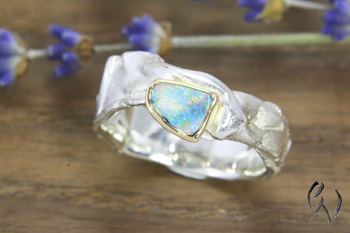 Dieser schöne Ring aus Silber 925/- hat seine Wirkung durch das Zusammenspiel von dem teil polierten und teils mattierten Silber und dem in Gelbgold 750/- gefassten Opal. Das kräftige Goldgelb verstärkt die Blautöne des Opals und bringt ihn so zum Leuchten.