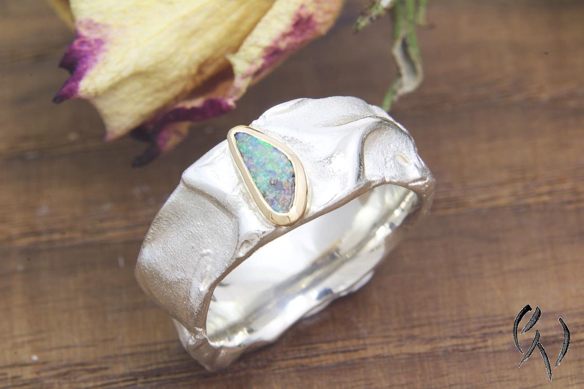 So wie das Meer durch seine Wellen, die im Sonnenlicht leuchten und die verschiedenen Grüntöne in der Tiefe fasziniert, wirkt auch dieser Ring aus Silber 925/- durch das Zusammenspiel von dem polierten und mattierten Silber auf der unregelmäßigen Oberfläche. Der in Gold 750/- gefasste Boulderopel schimmert wie der mit Seegras bewachsene Meeresboden, wenn die Sonnenstrahlen in das Wasser fallen.