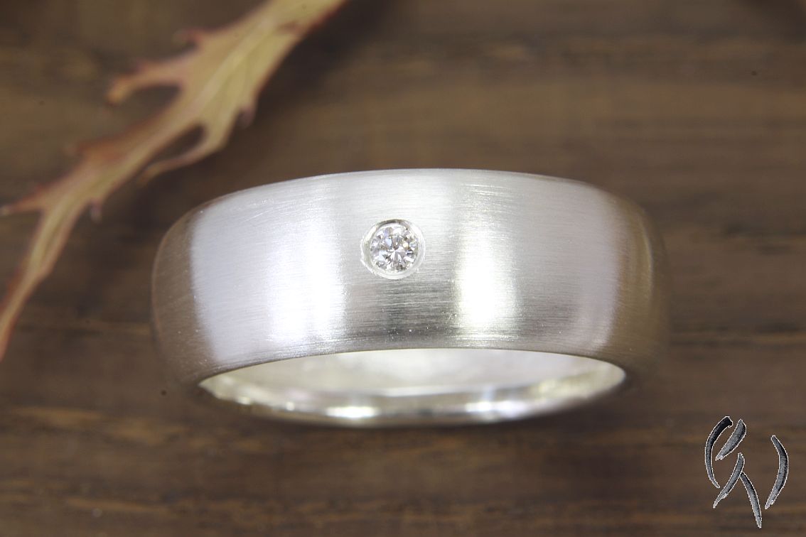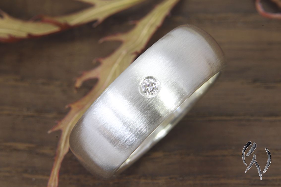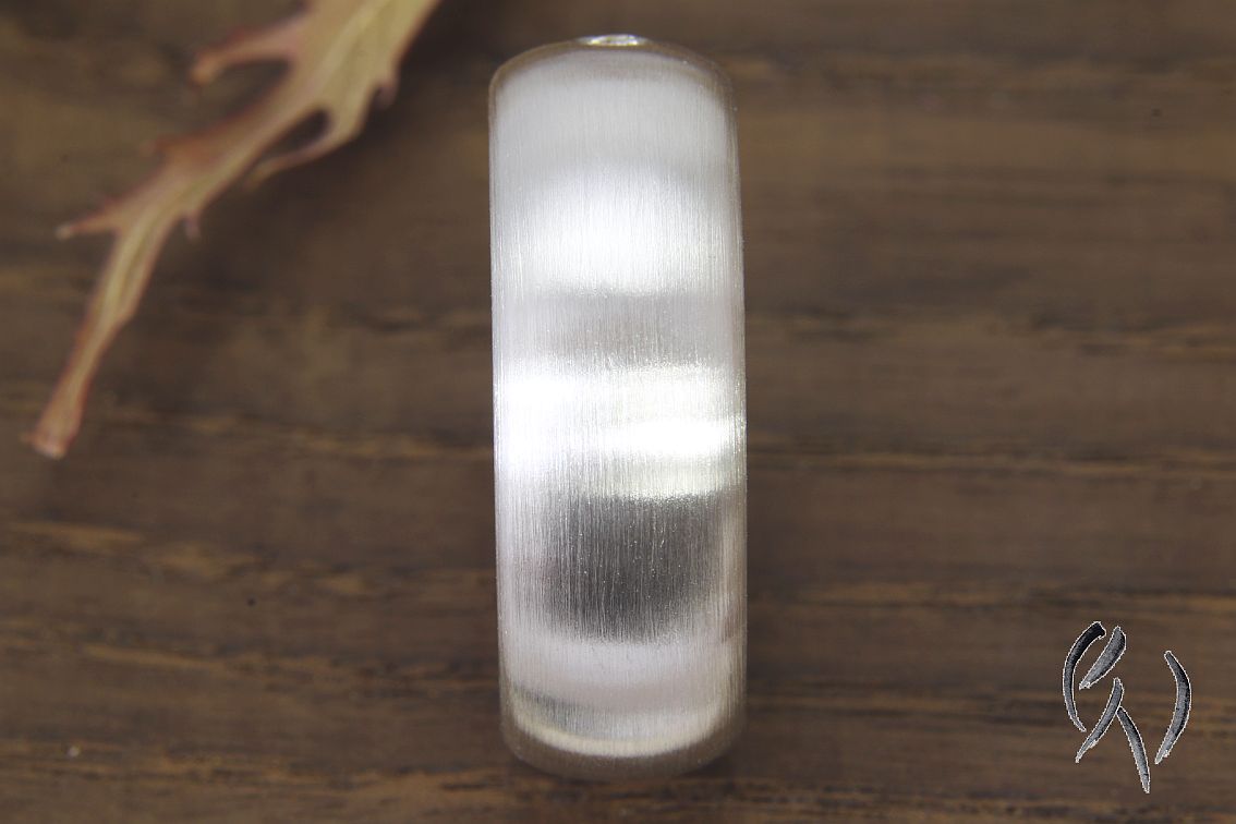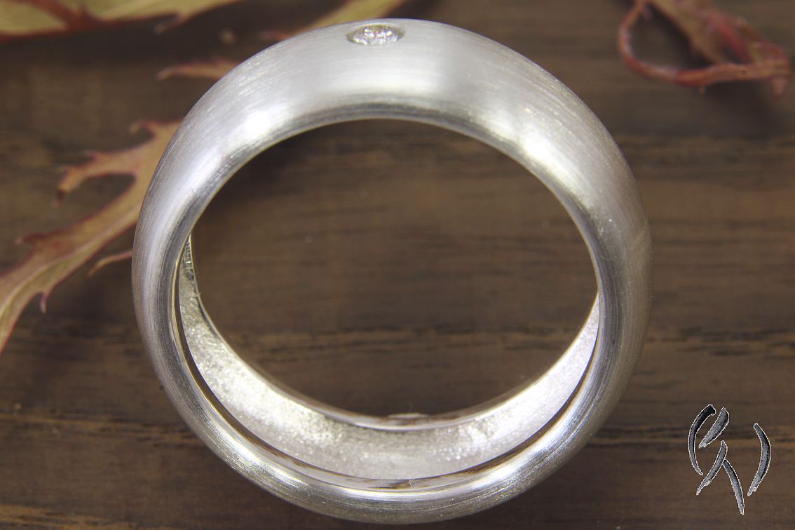 Der Ring hat eine schöne, gewölbte Oberflächer mit seidenmatter Struktur. Innen ist die Ringschiene ausgefräst, so ist der Ring nicht so schwer wie ein massiver Ring.